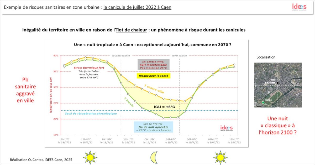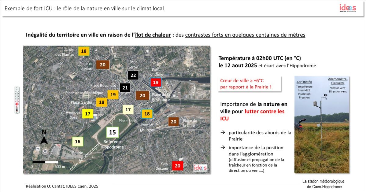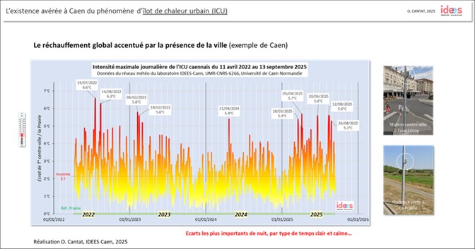 En moyenne, l’écart journalier maximum entre le cœur de Caen et la Prairie est de l’ordre de 2°C mais il peut dépasser 4 à 6°C lorsque les conditions sont optimales, notamment en été, grâce à de plus longues périodes anticycloniques.