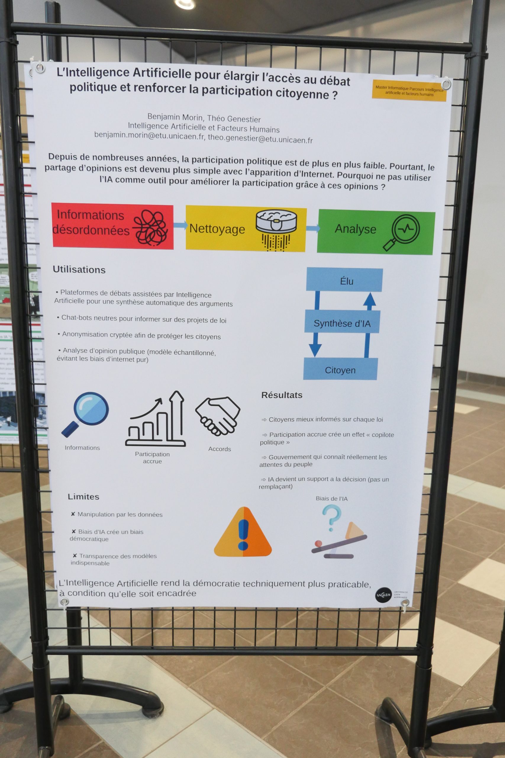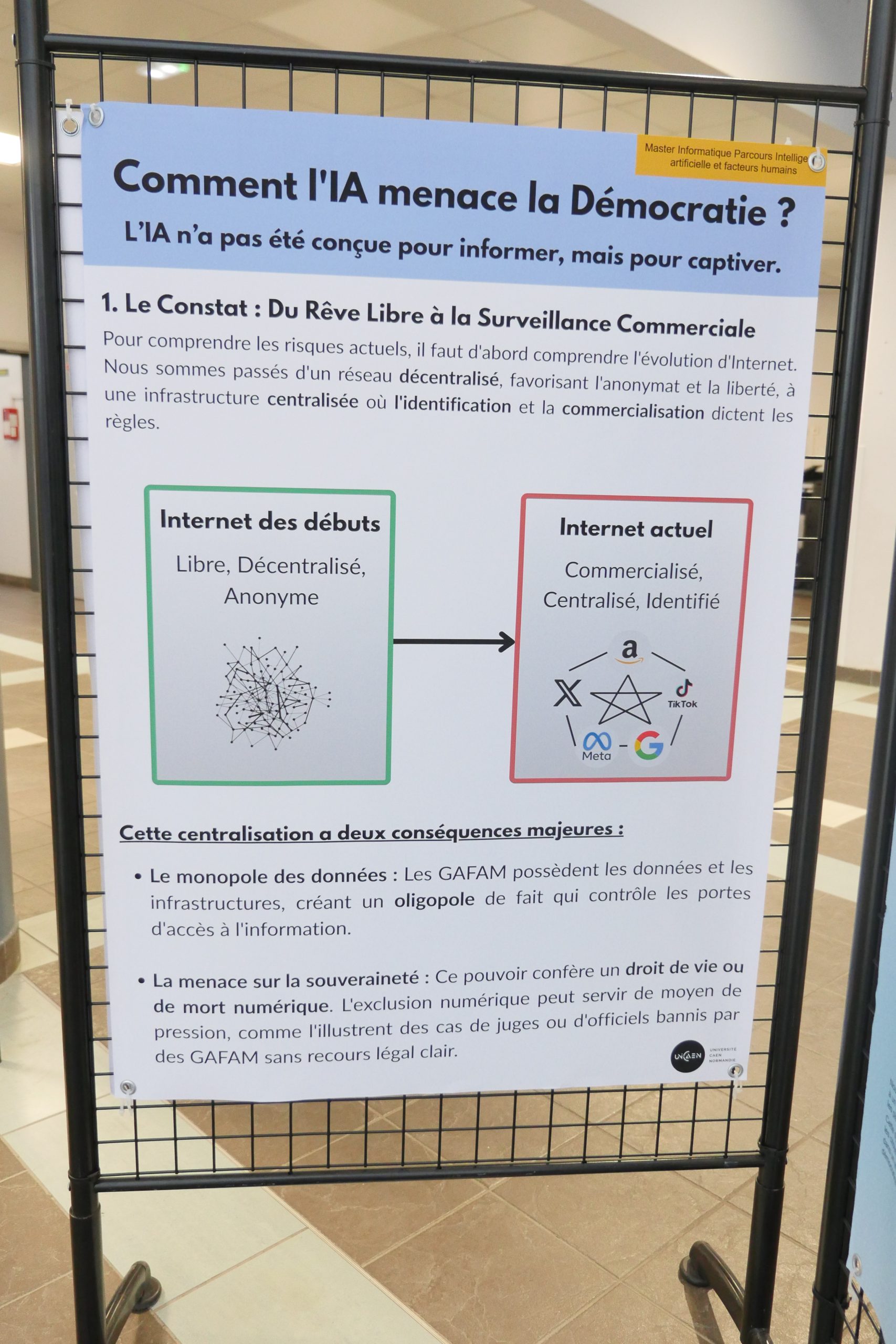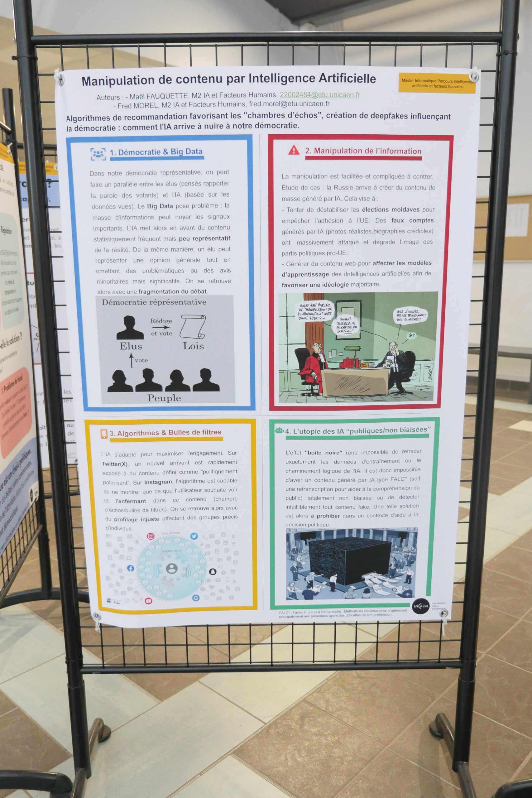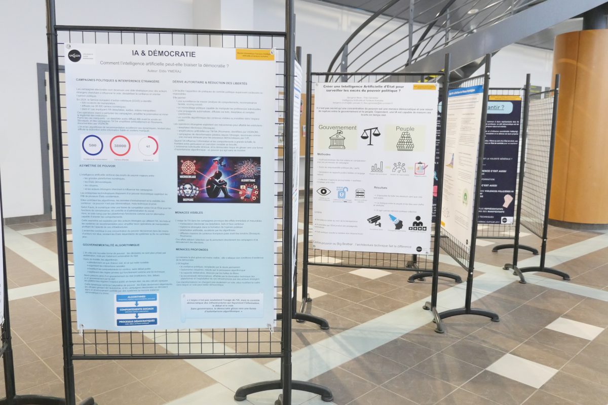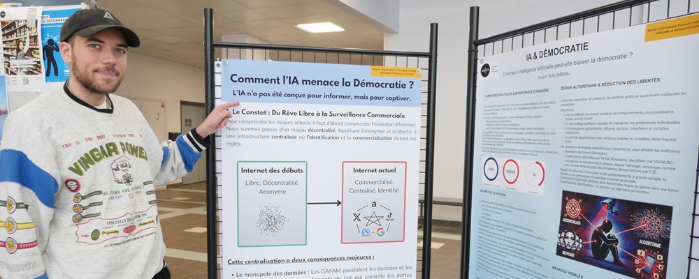 Désinformation, algorithmes de recommandation, concentration des médias, transformation des métiers… Dans le cadre de leur master 2 Informatique parcours IA et facteurs humains, des étudiants et étudiantes ont choisi d’explorer les liens entre intelligence artificielle et démocratie. Pendant quatre mois, ils ont conçu une exposition qui interroge moins la performance technologique que ses effets sociaux et politiques. Rencontre avec Andrea, étudiant en M2 informatique.