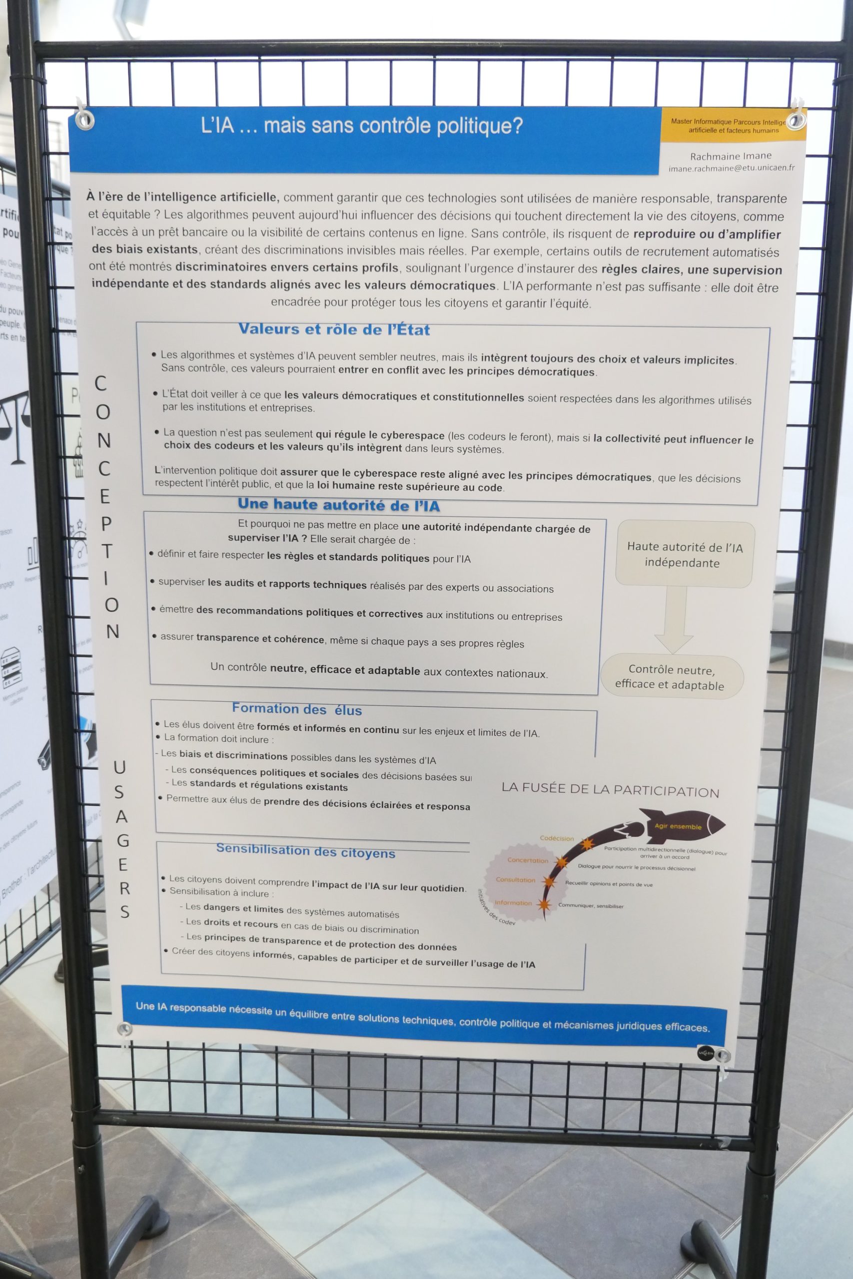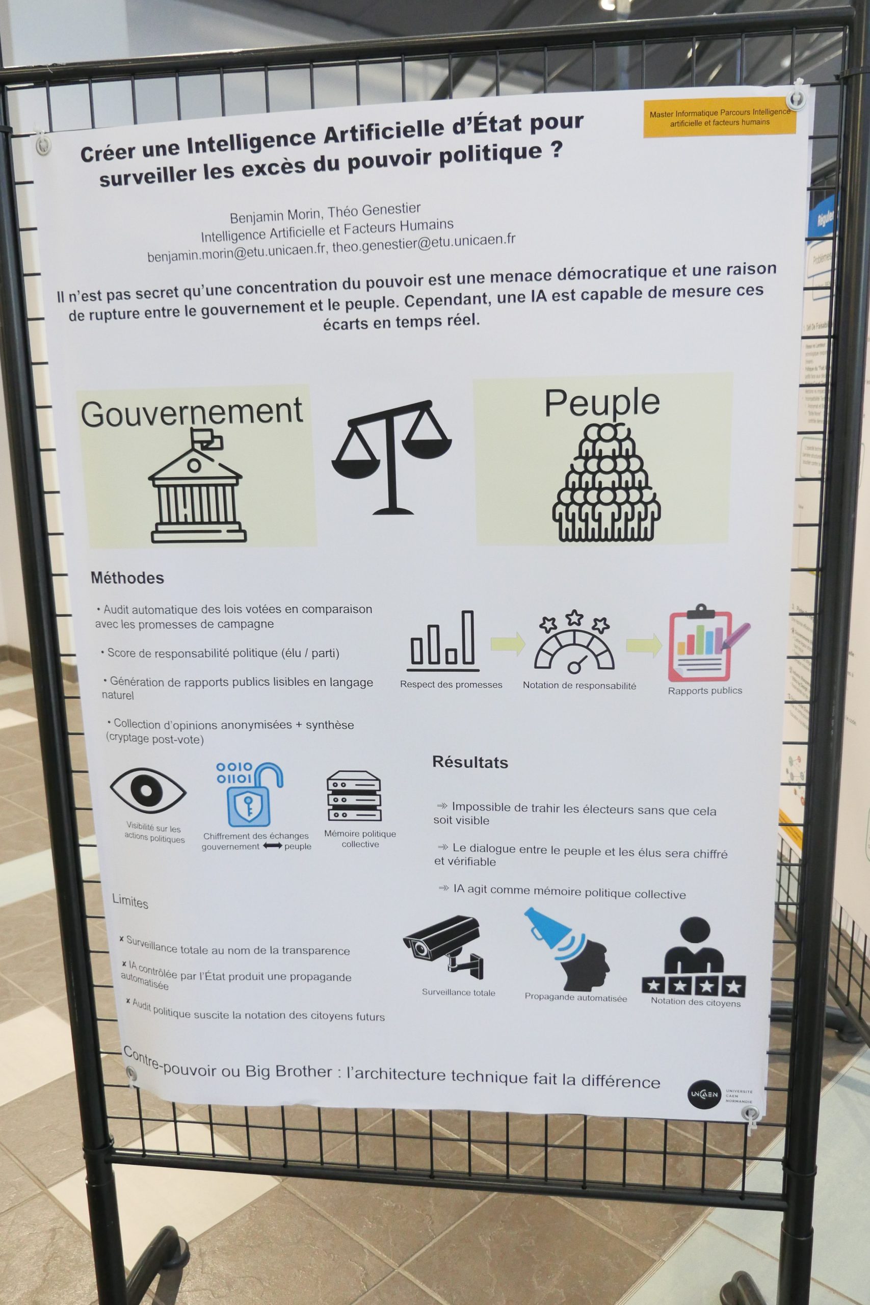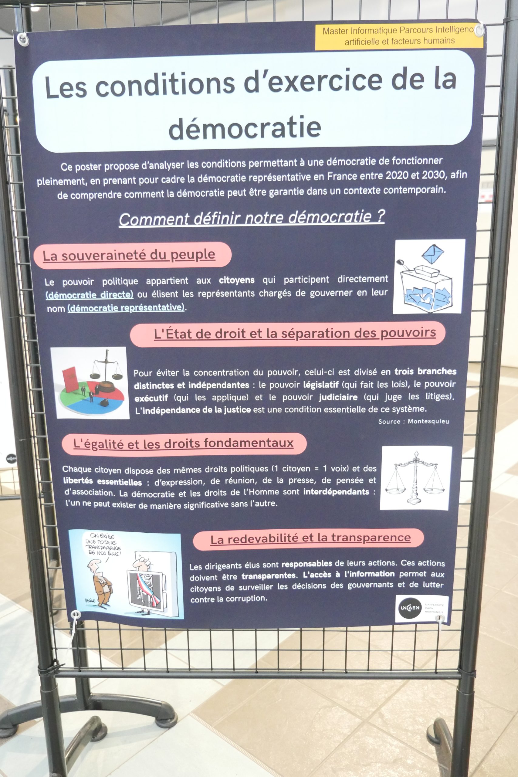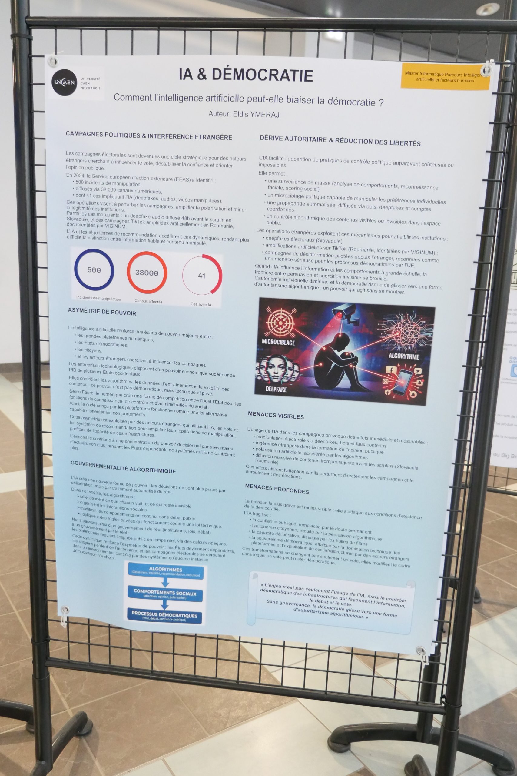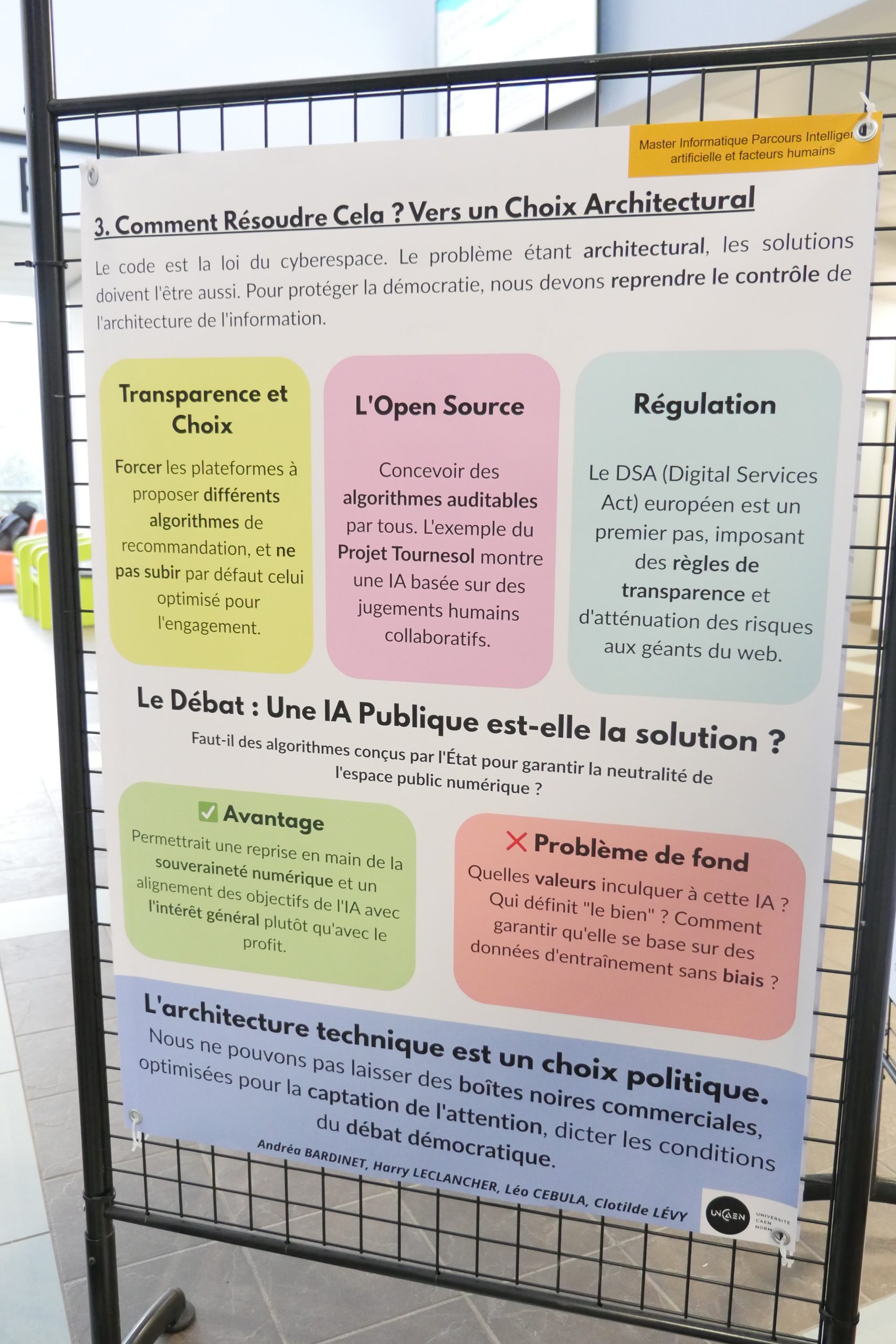 Désinformation, algorithmes de recommandation, concentration des médias, transformation des métiers… Dans le cadre de leur master 2 Informatique parcours IA et facteurs humains, des étudiants et étudiantes ont choisi d’explorer les liens entre intelligence artificielle et démocratie. Pendant quatre mois, ils ont conçu une exposition qui interroge moins la performance technologique que ses effets sociaux et politiques. Rencontre avec Andrea, étudiant en M2 informatique.