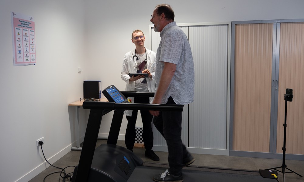 Reconstitution d'un environnement simulant un cabinet médical ou de kinésithérapie au sein du laboratoire COMETE, avec un tapis roulant utilisé pour l’analyse de la marche.