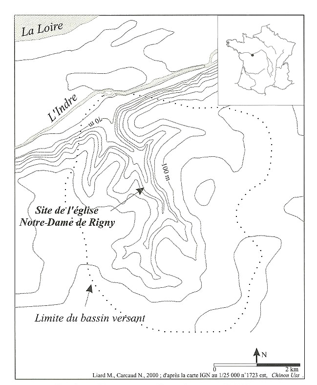 1L’église est située au fond d’un vallon qui constitue un petit bassin versant de rang 1, d’orientation SSE-NW, affluent de rive gauche de la vallée de l’Indre et de la Loire (Fig. 5).
