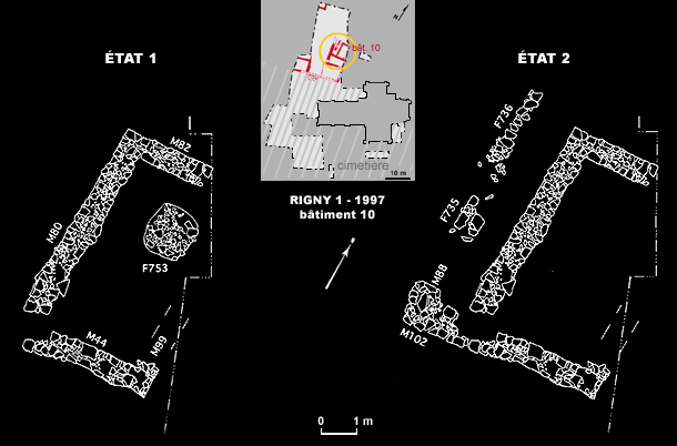 Le bâtiment 10 a connu deux états successifs, séparés par une reconstruction presque complète des murs. Dans le deuxième état, un appentis a été ajouté contre le mur gouttereau ouest.