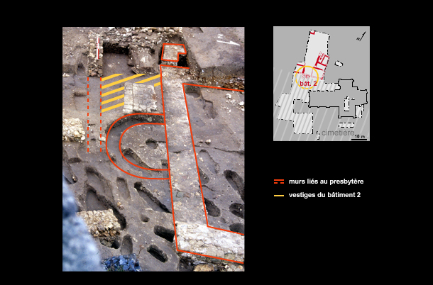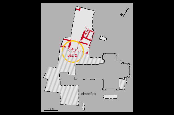 Le bâtiment 2 a été détruit par la construction, au milieu du 15e s., du nouveau mur de clôture du presbytère, et les seuls vestiges conservés sont situés à l’intérieur de la cour de celui-ci. Le reste du bâtiment, à l’extérieur de la clôture, a été détruit par les inhumations. Ses dimensions sont inconnues.