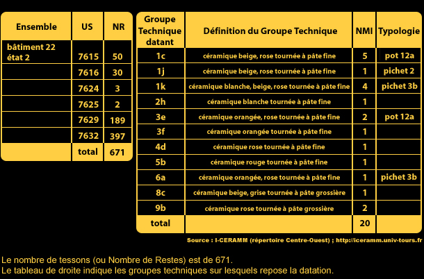 P0/7. La datation des tessons de céramique contenus dans les couches d’occupation de l’État 1 du bâtiment 22 s’étend du milieu du 12e s. à la fin du 13e s.