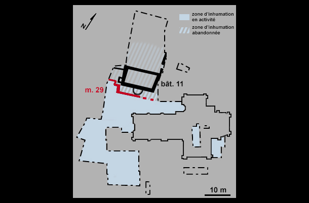 Elle est marquée au nord-ouest par la construction du mur de clôture du presbytère (M29) qui empiète sur l’espace funéraire, et au sud-est par l’abandon de la zone d’inhumation au chevet de l’église.