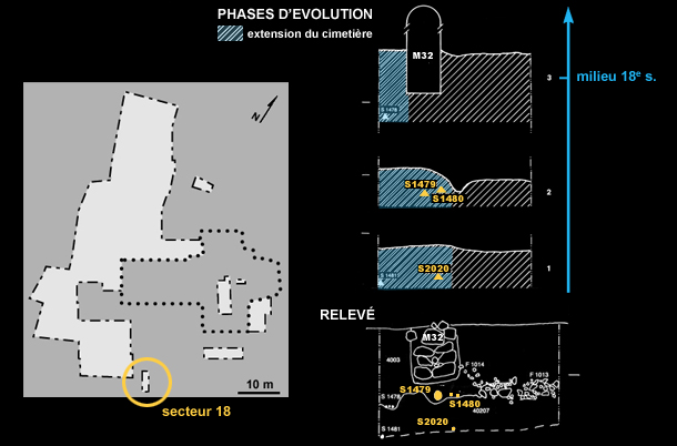 P0/24. Après 1752, de nouveaux murs de clôture délimitent un Grand et un Petit cimetière réservé aux enfants.