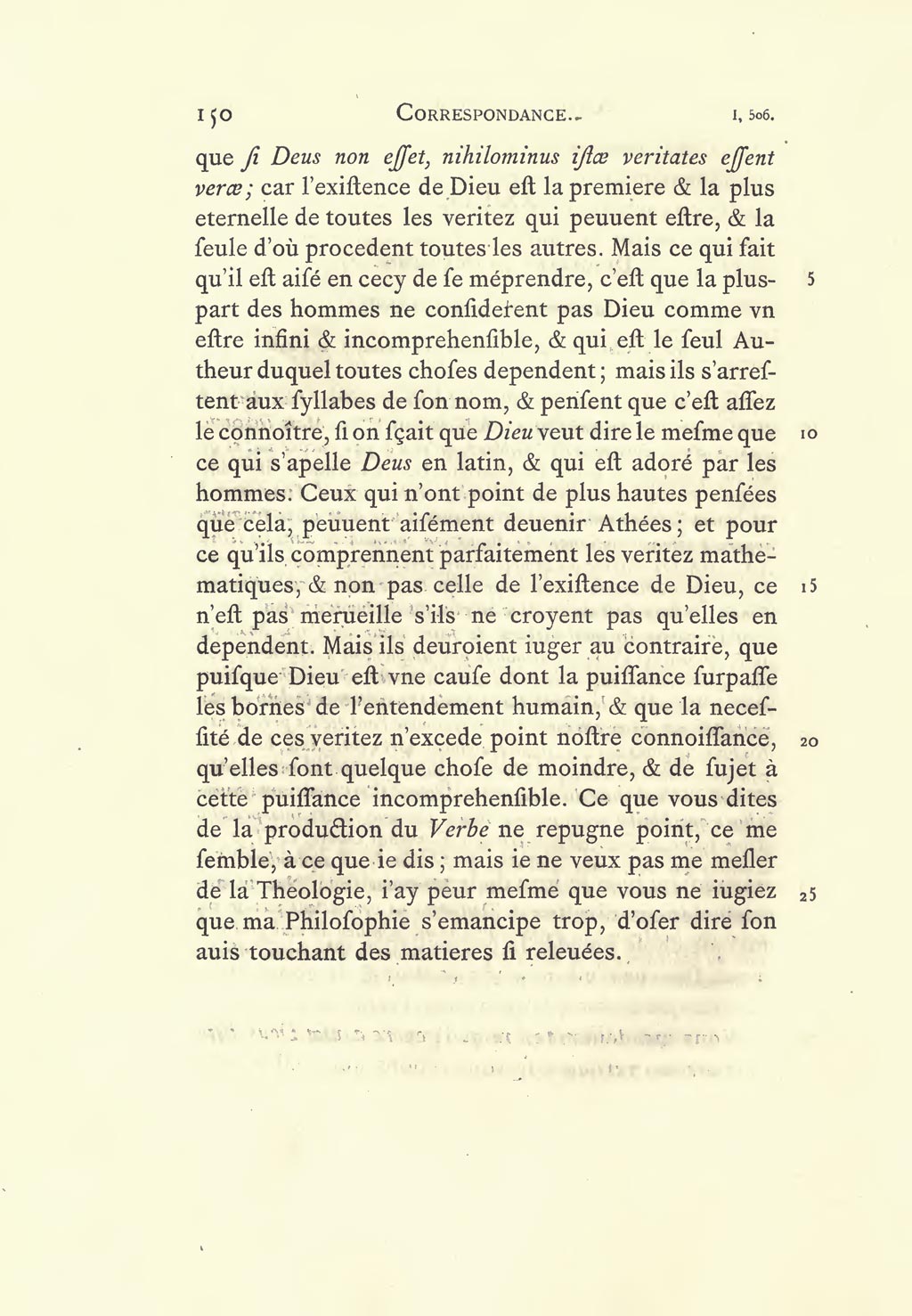 que si Deus non esset, nihilominus istæ veritates essent veræ, car l’existence de Dieu est la premiere et la plus eternelle de toutes les veritez qui peuvent estre, et la seule d’où procedent toutes les autres. Mais ce qui fait qu’il est aisé en cecy de se méprendre, c’est que la plus-part des hommes ne considerent pas Dieu comme un estre infini et incomprehensible, et qui est le seul Autheur duquel toutes choses dependent : Mais ils s’arrestent aux syllabes de son nom, et pensent que c’est assez le connoître, si on sçait que Dieu veut dire le mesme que ce qui s’appelle Deus en latin, et qui est adoré par les-hommes. Ceux qui n’ont point de plus hautes pensées que cela, peuvent aisément devenir Athées ; Et pource qu’ils comprennent parfaitement les veritez mathematiques, et non pas celle de l’existence de Dieu, ce n’est pas merveille s’ils ne croyent pas qu’elles en dependent. Mais ils devroient iuger au contraire, que puisque Dieu est une cause dont la puissance surpasse les bornes de l’entendement humain, et que la necessité de ces veritez n’excede point nostre connoissance, qu’elles sont quelque chose de moindre, et de sujet à cette puissance incomprehensible. Ce que vous dites de la production du Verbe ne repugne point ce me semble à ce que ie dis ; mais ie ne veux pas me mesler de la Theologie, i’y peur mesme que vous ne iugiez que ma Philosophie s’emancipe trop, d’oser dire son avis touchant des matieres si relevées.