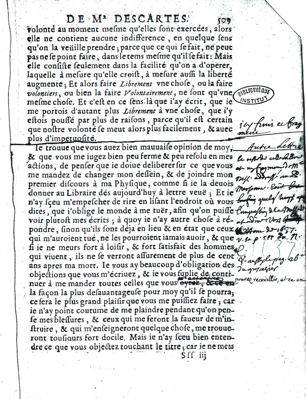 Pour le libre Arbritre, ie suis entierement d’accord avec le R. P. Et pour expliquer encore plus nettement mon opinion, ie desire premierement que l’on remarque, que l’Indifference me semble signifier proprement cet état dans lequel la volonté se trouve, lors qu’elle n’est point portée par la connoissance de ce qui est vray, ou de ce qui Clerselier I, 507