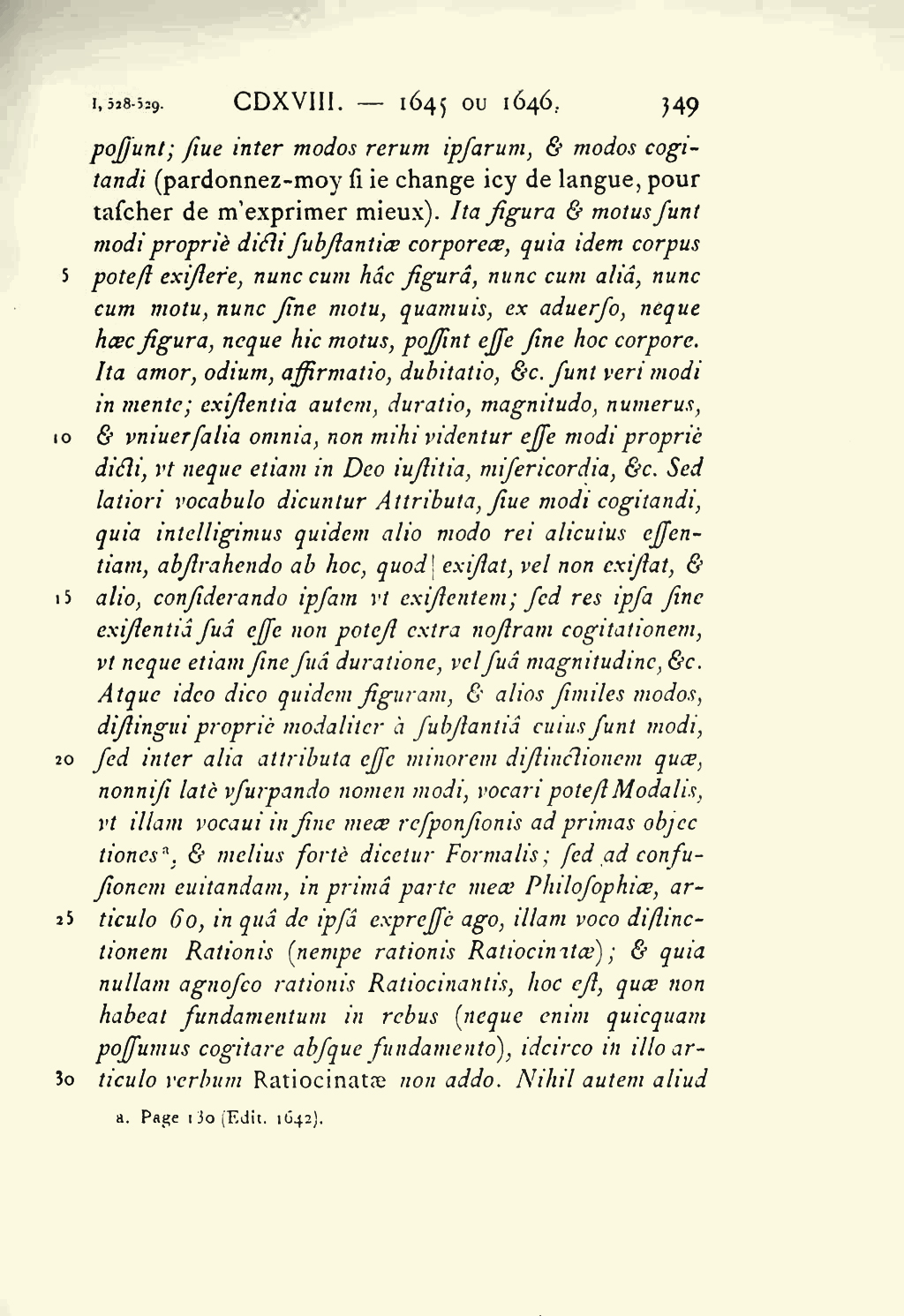 possunt ; sive inter modos rerum ipsarum, et modos cogitandi, (Pardonnez–moy si ie change icy de langue, pour tascher de m’exprimer mieux) Ita figura et motus sunt modi propriè dicti substantiae Corporeæ, quia idem corpus potest existere, nunc cum hac figura, nunc cum alia ; nunc cum motu, nunc sine motu, quamvis ex adverso neque hæc figura, neque hic motus, possint esse sine hoc corpore ; Ita amor, odium, affirmatio, dubitatio, etc. sunt veri modi in mente ; existentia autem, duratio, magnitudo, numerus, et universalia omnia, non mihi videntur esse modi propriè dicti, ut neque etiam in Deo iustitia, misericordia, etc. Sed latiori vocabulo dicuntur Attributa, sive modi cogitandi, quia intelligimus quidem alio modo rei alicuius essentiam, abstrahendo ab hoc, quod Clerselier I, 529