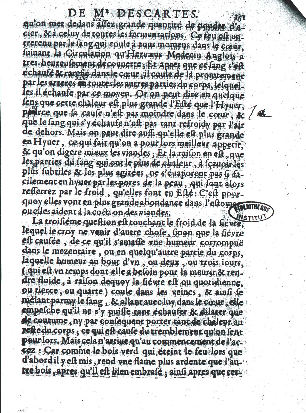 La troisiéme question est touchant le froid de la fiévre, lequel ie croy ne venir d’autre chose, sinon que la fiévre est causée, de ce qu’il s’amasse une humeur corrompuë dans le mezentaire, ou en quelqu’autre partie du corps, laquelle humeur au bout d’un, ou deux, ou trois iours, (qui est un temps dont elle a besoin pour la meurir et rendre fluide, à raison dequoy la fiévre est ou quotidienne, ou tierce, ou quarte) coule dans les veines, et ainsi se mélant parmy le sang, et allant avec luy dans le cœur, elle empesche qu’il ne s’y puisse tant échaufer et dilater que de coutume, ny par consequent porter tant de chaleur au reste du corps ; ce qui est cause du tremblement qu’on sent pour lors. Mais cela n’arrive qu’au commencement de l’accez : Car comme le bois verd qui éteint le feu lors que d’abord il y est mis, rend une flame plus ardente que l’autre bois, apres qu’il est bien embrasé ; ainsi apres que cette Clerselier I, 152