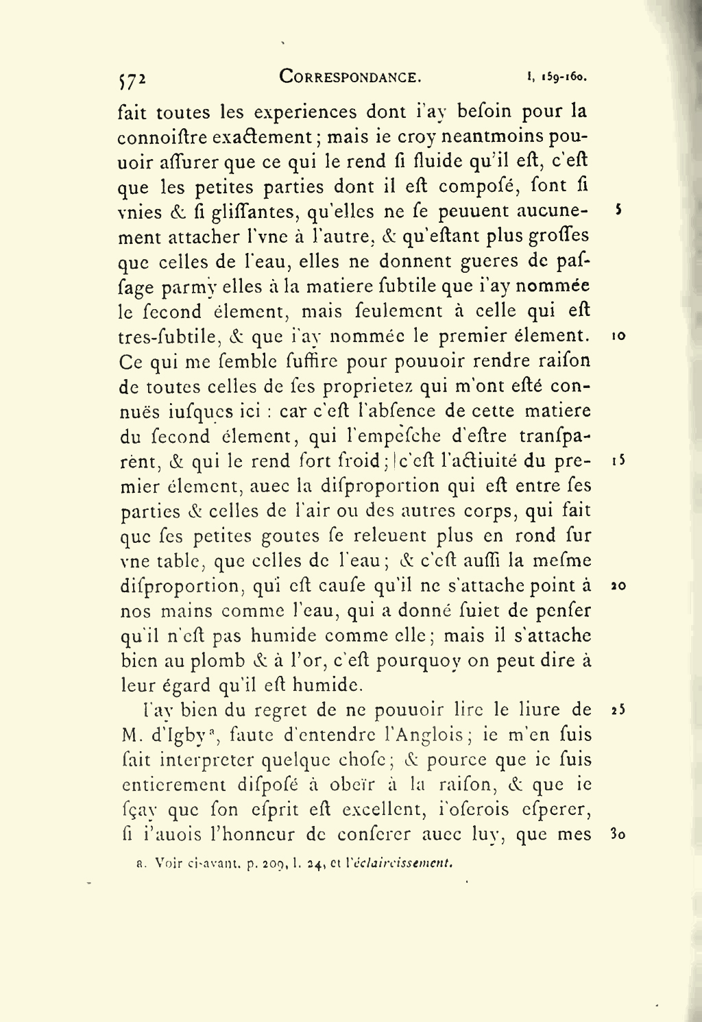 fait toutes les experiences dont i’ay besoin pour la connoistre exactement ; Mais ie croy neantmoins pouvoir assurer que ce qui le rend si fluide, qu’il est, c’est que les petites parties dont il est composé, sont si unies et si glissantes, qu’elles ne se peuvent aucunement attacher l’une à l’autre, et qu’étant plus grosses que celles de l’eau, elles ne donnent gueres de passage parmy elles à la matiere subtile que i’ay nommée le second élement, mais seulement à celle qui est tres-subtile, et que i’ay nommée le premier élement ; Ce qui me semble suffire pour pouvoir rendre raison de toutes celles de ses proprietez qui m’ont esté connuës iusques icy : Car c’est l’absence de cette matiere du second élement, qui l’empesche d’estre transparens, et qui le rend fort froid, Clerselier I, 160