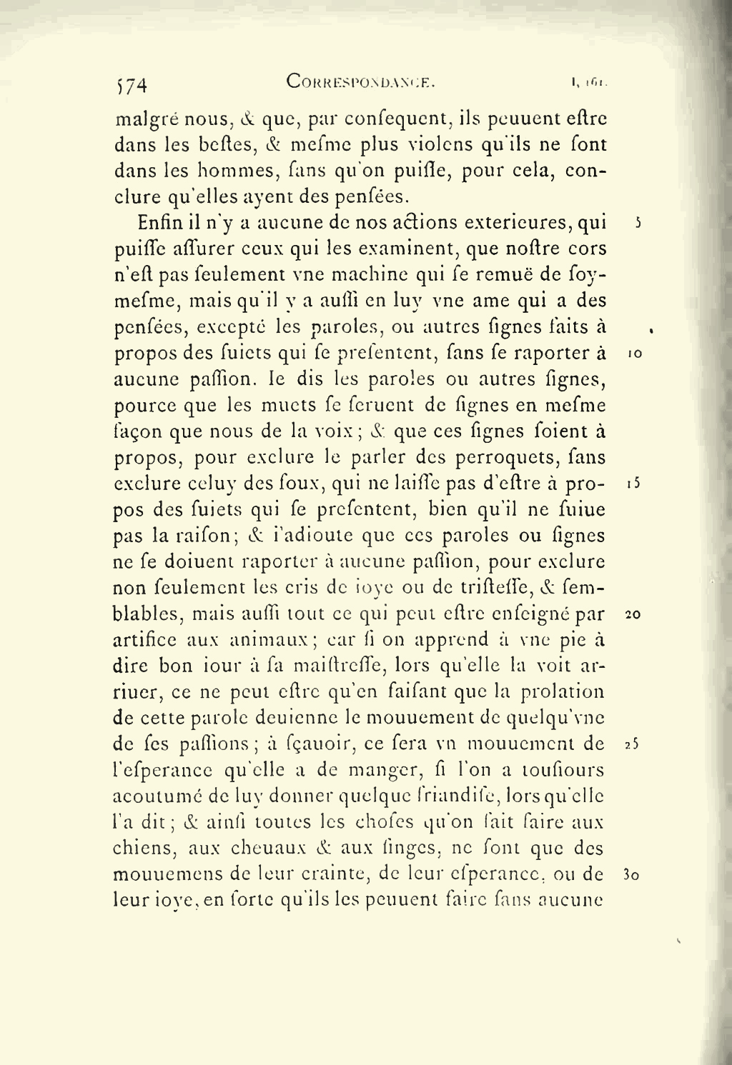 d’homme à beste, il ne s’est toutesfois iamais trouvé aucune beste si parfaite, qu’elle ait usé de quelque signe, pour faire entendre à d’autres animaux quelque chose qui n’eust point de rapport à ses passions ; Et il n’y a point d’homme si imparfait qu’il n’en use ; en sorte que ceux qui sont sours et muets inventent des signes particuliers par lesquels ils expriment leurs pensées. Ce qui me semble un tres-fort argument, pour prouver que ce qui fait que les bestes ne parlent point comme nous, est qu’elles n’ont aucune pensée, et non point que les organes leur manquent. Et on ne peut dire qu’elles parlent entr’elles, mais que nous ne les entendons pas ; Car comme les chiens, et quelques-autres animaux nous expriment leurs passions, ils nous exprimeroient aussi bien leurs pensées, s’ils en avoient. Ie sçay bien que les bestes font beaucoup de choses mieux que nous, mais ie ne m’en estonne pas : Car cela mesme sert à prouver qu’elles agissent naturellement et par ressors, ainsi qu’une horloge, laquelle monstre bien mieux l’heure qu’il est, que nostre jugement ne nous l’enseigne. Et sans doute que lors que les hirondelles viennent au Printemps, elles agissent en cela comme des horloges. Tout ce que font les mouches à miel est de mesme nature, et l’ordre que tiennent les gruës en volant, et celuy qu’observent les singes en se battant, s’il est vray qu’ils en observent quelqu’un ; AT IV, 576