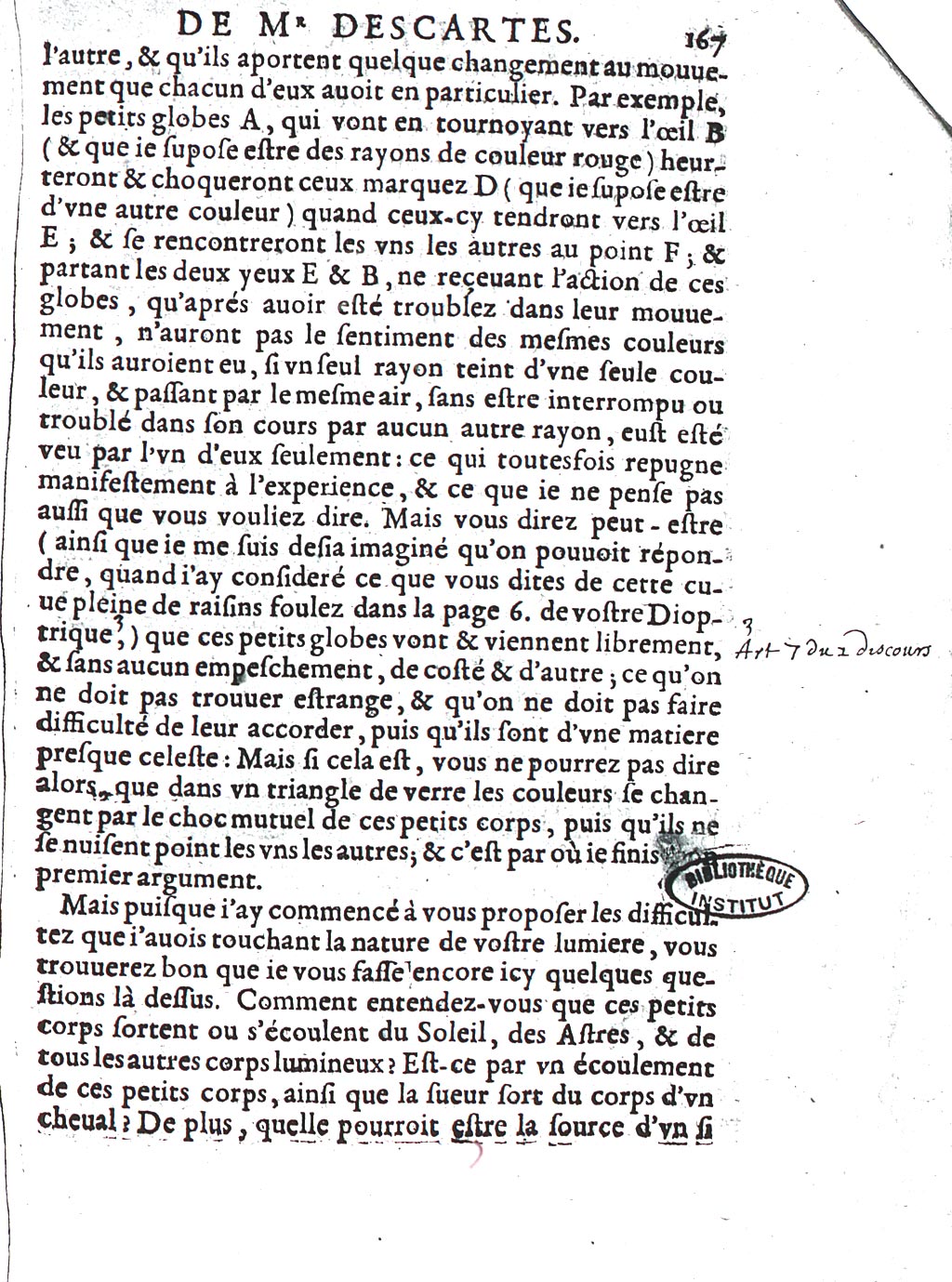 vous dites que la petite boule du milieu 1234. commencera à tourner, ainsi que la raison et l’experience nous peuvent apprendre. Mais comme la Philosophie que vous cultivez est nouvelle, il est mal-aisé de la pouvoir combattre que par vos Principes mesmes ; c’est pourquoy ie prens de là occasion de vous faire deux argumens ; Par le premier, qui combat la nature de vostre lumiere, ie pretens monstrer, Qu’il n’est pas vray que la vision depende du mouvement ou de l’inclination à se mouvoir de ces petits corps ; Et par l’autre, Qu’il ne s’ensuit pas de là qu’un triangle de verre doive avoir ou produire diverses couleurs.
