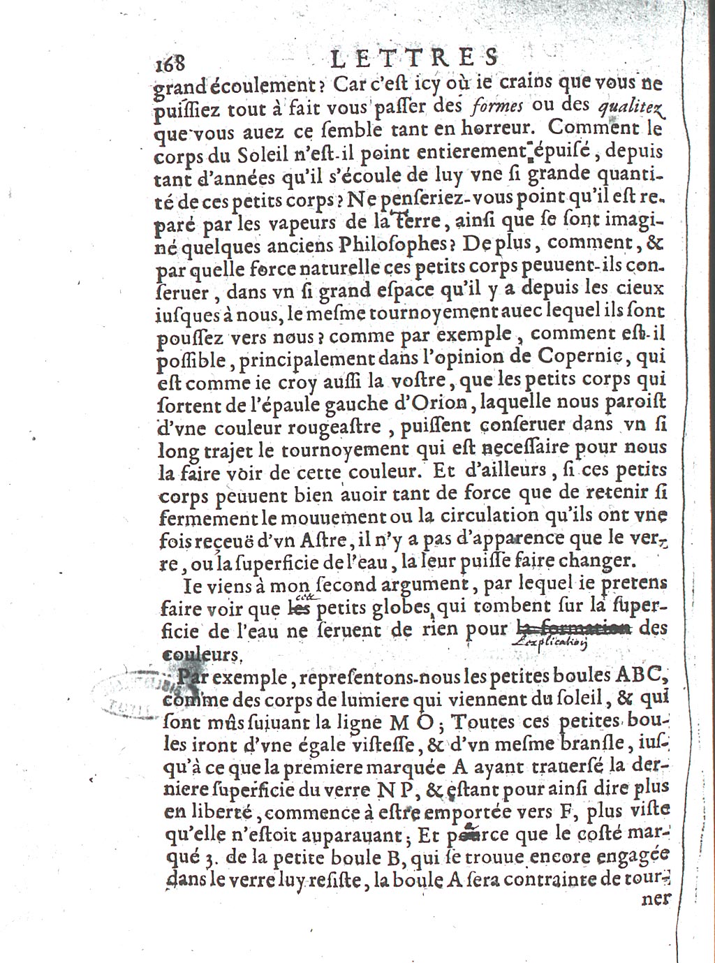 grand écoulement ? Car c’est icy où ie crains que vous ne puissiez tout à fait vous passer des formes ou des qualitez que vous avez ce semble tant en horreur. Comment le corps du Soleil n’est-il point entierement épuisé, depuis tant d’années qu’il s’écoule de luy une si grande quantité de ces petits corps ? Ne penseriez-vous point qu’il est reparé par les vapeurs de la terre, ainsi que se sont imaginé quelques anciens Philosophes ? De plus, comment, et par quelle force naturelle ces petits corps peuvent-ils conserver, dans un si grand espace qu’il y a depuis les cieux iusques à nous, le mesme tournoyement avec lequel ils sont poussez vers nous ? comme par exemple, comment est-il possible, principalement dans l’opinion de Copernic, qui est comme ie croy aussi la vostre, que les petits corps qui sortent de l’épaule gauche d’Orion, laquelle nous paroist d’une couleur rougeastre, puissent conserver dans un si long trajet le tournoyement qui est necessaire pour nous la faire voir de cette couleur. Et d’ailleurs, si ces petits corps peuvent bien avoir tant de force que de retenir si fermement le mouvement ou la circulation qu’ils ont une fois receuë d’un Astre, il n’y a pas d’apparence que le verre, ou la superficie de l’eau, la leur puisse faire changer.