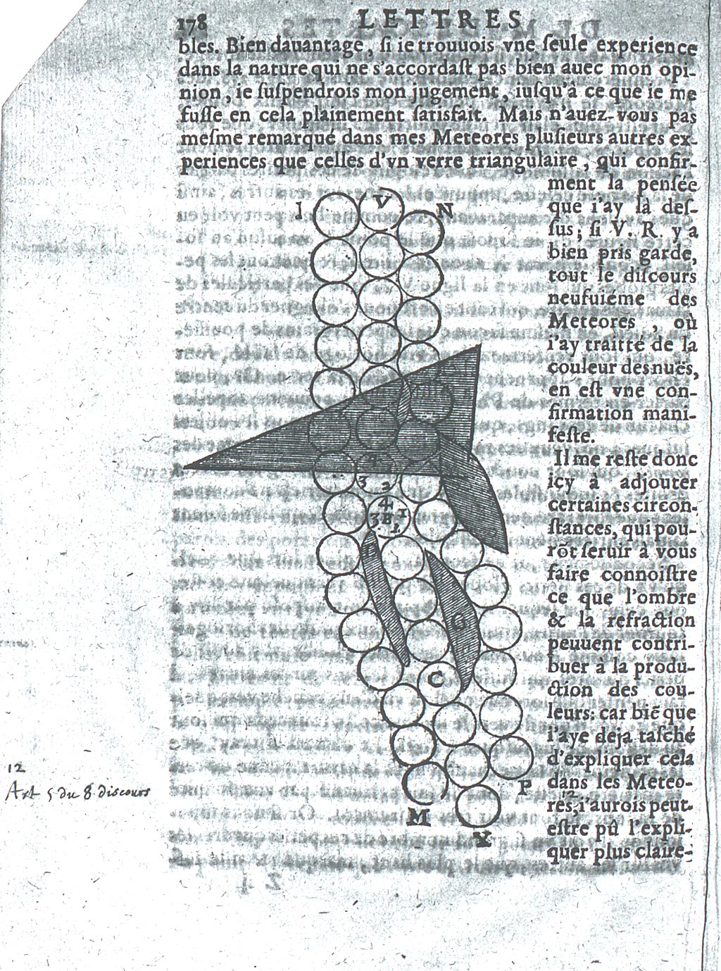 D’où l’on voit clairement ce que l’ombre contribuë à la production des couleurs ; car sans cela le rayon LM, ne feroit pas plus incliner vers un costé les petits globes du rayon VX, que NP les feroit incliner au contraire ; et ainsi la force de l’un seroit entierement détruite par celle de l’autre. On voit aussi par là ce que la refraction y contribuë ; Car sans elle les petits globes du rayon VX ne seroient pas plus disposez à tourner suivant l’ordre des chiffres 1234. que d’un autre sens ; et partant cette inclination qu’ils ont à tourner en ce sens-là ne seroit ny augmentée ny diminuée par les rayons voisins LM, NP ; ou mesme si nous suposons qu’elle fust par eux augmentée ; alors il faut croire qu’à cause des loix de l’Equilibre une autre semblable seroit autant diminuée dans les rayons voisins ; Et pource que le sens de la veuë ne peut pas estre mû par chaque rayon separement, mais seulement par plusieurs ensemble, cela est cause que ny l’une ny l’autre ne pourroit estre sentie.