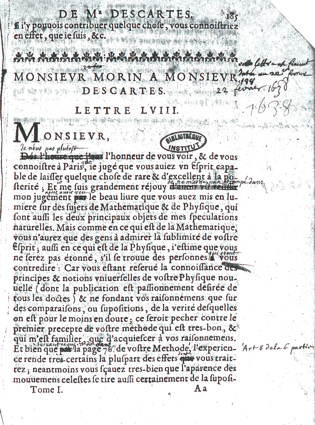 I’ay receu le beau livre que vous m’avez fait l’honneur de m’envoyer, et ie pense avoir dautant plus de sujet de vous en remercier, que ie l’ay moins merité ; car ie n’ay iamais eu occasion de vous rendre aucun service qui vous dûst convier à avoir cette souvenance de moy. Il est certain que la peine que vous avez prise pour trouver les longitudes ne merite rien moins qu’une recompense publique ; mais pource AT I, 314