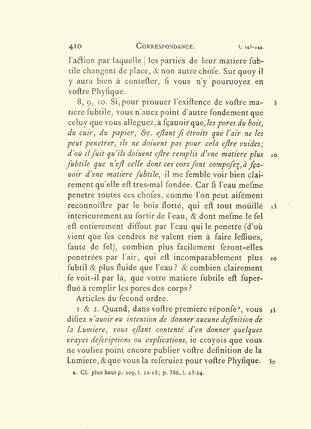 tuelle en la matiere et indeterminée, mais vous entendez l’impression faite par le moteur Lumineux, et reçeüe dans la matiere subtile, laquelle impression incline la matiere, et la determine plutost d’un costé que d’autre ; Et voila qui est fort subtil, puisque chaque œil incline la matiere subtile vers son opposé. Mais ie vous répons en premier lieu que ou la seule inclination de la matiere subtile est necessaire pour nous faire sentir la Lumiere, et ainsi le mouvement sera superflus ; ou que le mouvement est encore necessaire, et ainsi l’inclination seule ne suffira point. Secondement, que selon vous la Lumiere ne pourroit estre veüe dans le vuide, ou il n’y a ny matiere subtile, ny aucune autre chose ; lequel vuide s’il ne se donne en la nature, au moins on le peut imaginer, mesmes au dessus du premier Ciel : Or quand ie l’entreprendray, il me sera fort aisé de prouver que, Dato oculo et corpore Luminoso in congruâ distantiâ, non potest non videri lux etiam in vacuo. Finalement ie vous suplie de croire que ie n’ay point AT II, 417
