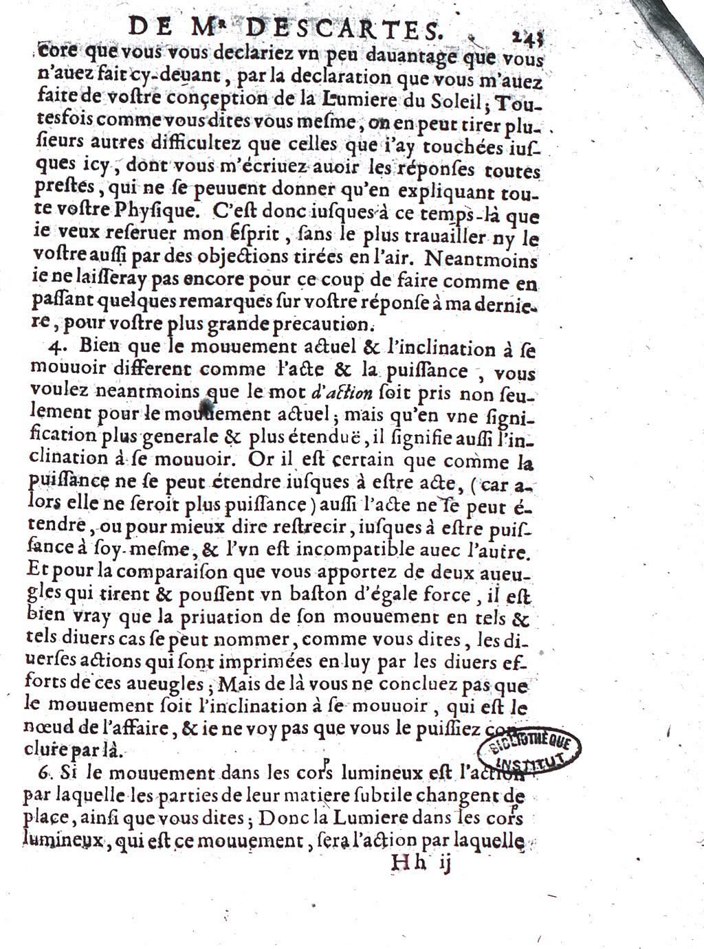 4. Bien que le mouvement actuel et l’inclination à se mouvoir different comme l’acte et la puissance, vous voulez neantmoins que le mot d’action soit pris non seulement pour le mouvement actuel ; mais qu’en une signification plus generale et plus étenduë, il signifie aussi l’inclination à se mouvoir. Or il est certain que comme la puissance ne se peut étendre iusques à estre acte, (car alors elle ne seroit plus puissance) aussi l’acte ne se peut étendre, ou pour mieux dire restrecir, iusques à estre puissance à soy-mesme, et l’un est incompatible avec l’autre. Et pour la comparaison que vous apportez de deux aveugles qui tirent et poussent un baston d’égale force, il est bien vray que la privation de son mouvement en tels et tels divers cas se peut nommer, comme vous dites, les diverses actions qui sont imprimées en luy par les divers efforts de ces aveugles ; Mais de là vous ne concluez pas que le mouvement soit l’inclination à se mouvoir, qui est le nœud de l’affaire, et ie ne voy pas que vous le puissiez conclure par là.