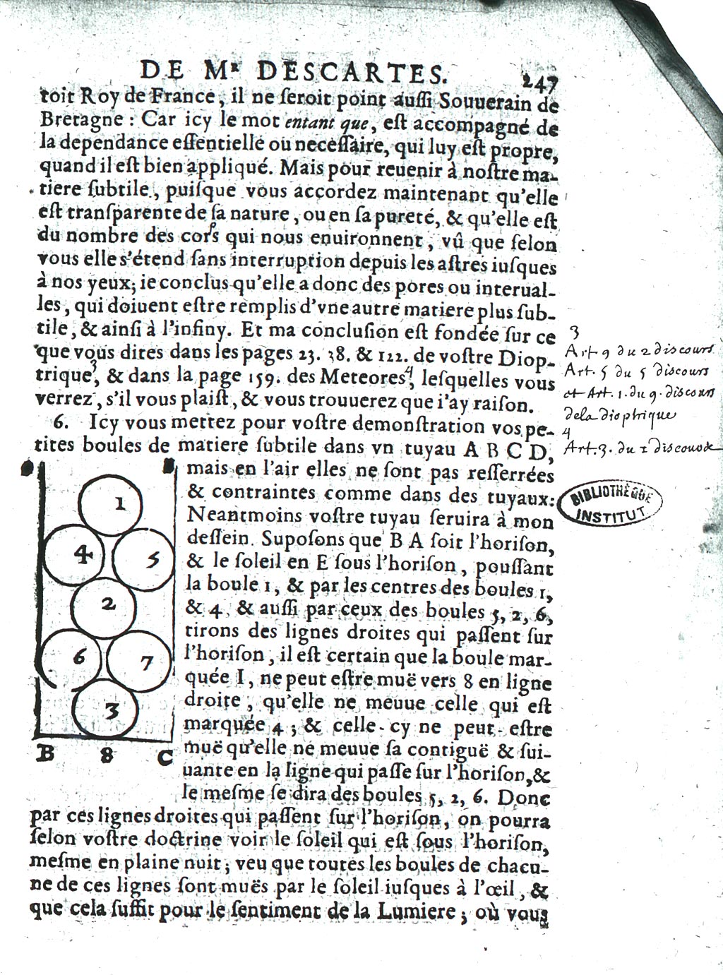 Vous voulez que vos boules de la page 258. des Meteores, soient des boules de bois ou autre matiere, et non des boules de vostre matiere subtile, comme tout le monde le croira, si vous n’y pourvoyez ; Et pour vostre raison, vous dites que vous avez voulu donner à entendre vostre conception par quelque chose de plus sensible, que ne sont les boules de la matiere subtile, et ainsi soumettre vos raisons au iugement de l’experience. Mais en premier lieu il n’y a homme au monde qui puisse faire l’experience que vous dites sur des boules de bois ; Secondement pourquoy faites-vous la boule V mobile en l’air seulement en ligne droite, et les autres encore en rond, vû que toutes les boules de la matiere subtile se meuvent en l’air circulairement et en ligne droite tout ensemble, selon ce que vous dites en la page 272. En troisiéme lieu, pourquoy n’avez-vous pas expliqué les propres mouvemens des boules de vostre matiere subtile, et les effets qu’elles font quand elles viennent à rencontrer quelque superficie plus solide, sans emprunter Clerselier I, 251