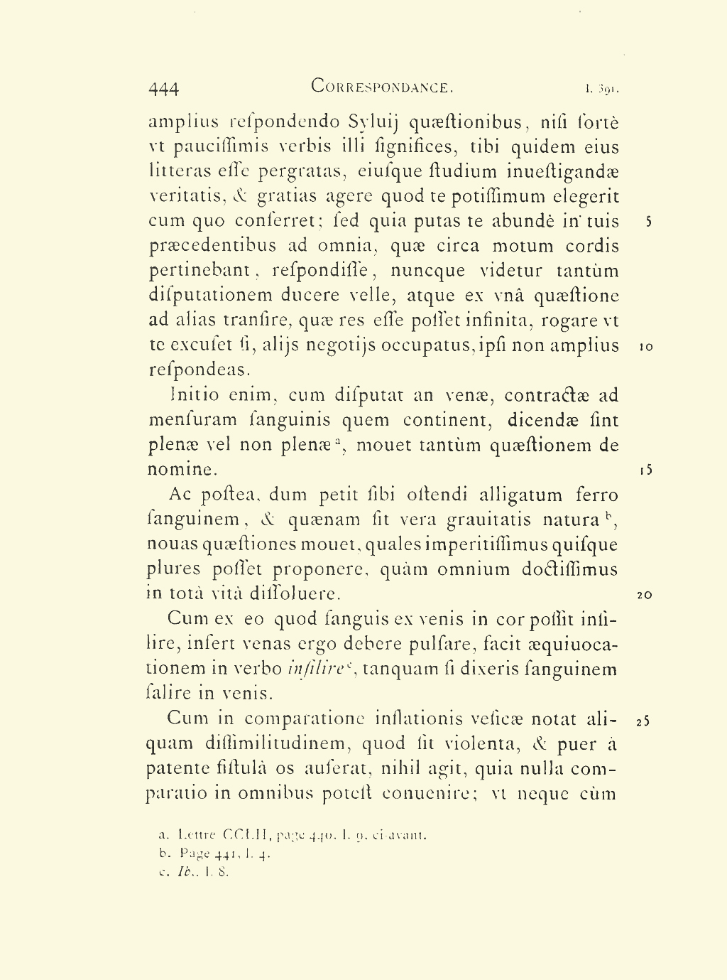 amplius respondendo Sylvij quæstionibus, nisi forte, ut paucissimis verbis illi significes, tibi quidem eius litteras esse pergratas, eiusque studium investigandæ veritatis, et gratias agere quod te potissimum elegerit cum quo conferret ; Sed quia putas te abundè in tuis præcedentibus ad omnia, quæ circa motum cordis pertinebant, respondisse, nuncque videtur tantum disputationem ducere velle, atque ex una quæstione ad alias transire, quæ res esse posset infinita, rogare ut te excuset, si aliis negotiis occupatus, ipsi non amplius respondeas. Initio enim, cum disputat an venæ, contractæ ad mensuram sanguinis quem continent, dicendæ sint plenæ vel non plenæ, movet tantum quæstionem de nomine. Ac postea, dum petit sibi ostĕdi alligatum ferro sanguinem, et quænam sit vera gravitatis natura, novas quæstiones movet, quales imperitissimus quisque plures posset proponere, quàm omnium doctissimus in tota vita dissolvere. Cum ex eo quod sanguis ex venis in cor possit insilire, infert venas ergo debere pulsare, facit æquivocationem in verbo insilire, tanquam si dixeris sanguinem salire in venis. Cum in comparatione inflationis vesicæ notat aliquam dissimilitudinem, quod sit violenta, et puer à patente fistulâ os auferat, nihil agit, quia nulla comparatio in omnibus potest convenire ; ut neque cum AT III, 445