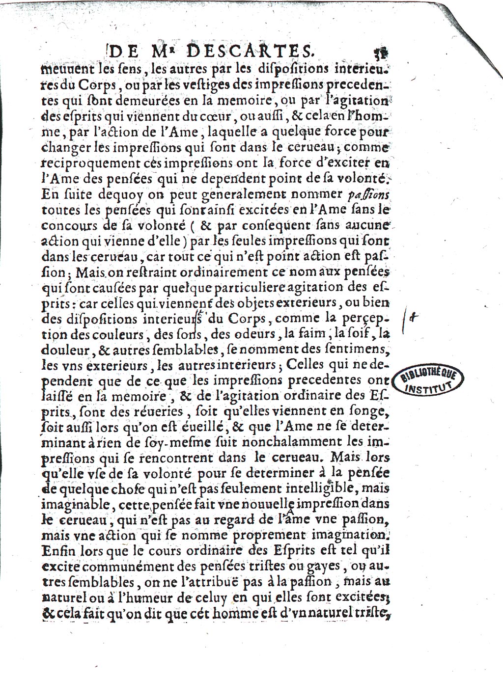 mens, les uns exterieurs, les autres interieurs ; Celles qui ne dependent que de ce que les impressions precedentes ont laissé en la memoire, et de l’agitation ordinaire des Esprits, sont des réveries, soit qu’elles viennent en songe, soit aussi lors qu’on est éveillé, et que l’Ame ne se determinant à rien de soy-mesme suit nonchalamment les impressions qui se rencontrent dans le cerveau. Mais lors qu’elle use de sa volonté pour se determiner à la pensée de quelque chose qui n’est pas seulement intelligible, mais imaginable, cette pensée fait une nouvelle impression dans le cerveau, qui n’est pas au regard de l’ame une passion, mais une action qui se nomme proprement imagination. Enfin lors que le cours ordinaire des Esprits est tel qu’il excite communément des pensées tristes ou gayes, ou autres semblables, on ne l’attribuë pas à la passion, mais au naturel ou à l’humeur de celuy en qui elles sont excitées ; et cela fait qu’on dit que cét homme est d’un naturel triste, Clerselier I, 32