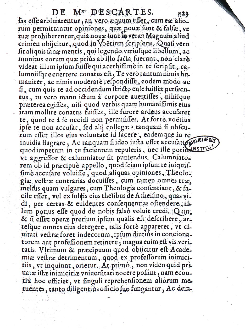 eius iram mollire conatus fuisses, ille furore ardens accusaret te, quod te à se occidi non permisisses. At forte voëtius ipse te non accusat, sed alij collegæ ? tanquam si obscurum esset illos eius voluntate id facere, eademque in te invidia flagrare ; Ac tanquam si ideo iusta esset accusatio quod impetum in te facientem repuleris, nec ille potius ut aggressor et calumniator sit puniendus. Calumniatorem ob id præcipuè appello, quod sciam ipsum te iniquissimè accusare voluisse, quod aliquas opiniones, Theologiæ vestræ contrarias docuisses, cum tamen omnes tuæ, melius quam vulgares, cum Theologia consentiant, et facile esset, vel ex soleis eius thesibus de Atheismo, quas vidi, per certas et evidentes consequentias ostendere, illum potius esse quod de nobis falsò voluit credi. Quin, et si esset operæ pretium ipsum qualis est describere, artesque omnes eius detegere, talis fortè appareret, ut civitati vestræ foret indecorum, ipsum diutiùs in concionatorem aut professionem retinere ; magna enim est vis veritatis. Ultimum et præcipuum quod obiicitur est Academiæ vestræ detrimentum, quod ex professorum inimicitiis, ut inquiunt, orietur. At primò, non video quid privatæ istæ inimicitiæ universitati nocere possint ; nam econtrâ hoc efficiet, ut singuli reprehensionem aliorum metuentes, tanto diligentiùs officio suo fungantur ; Ac deinde, Clerselier I, 424