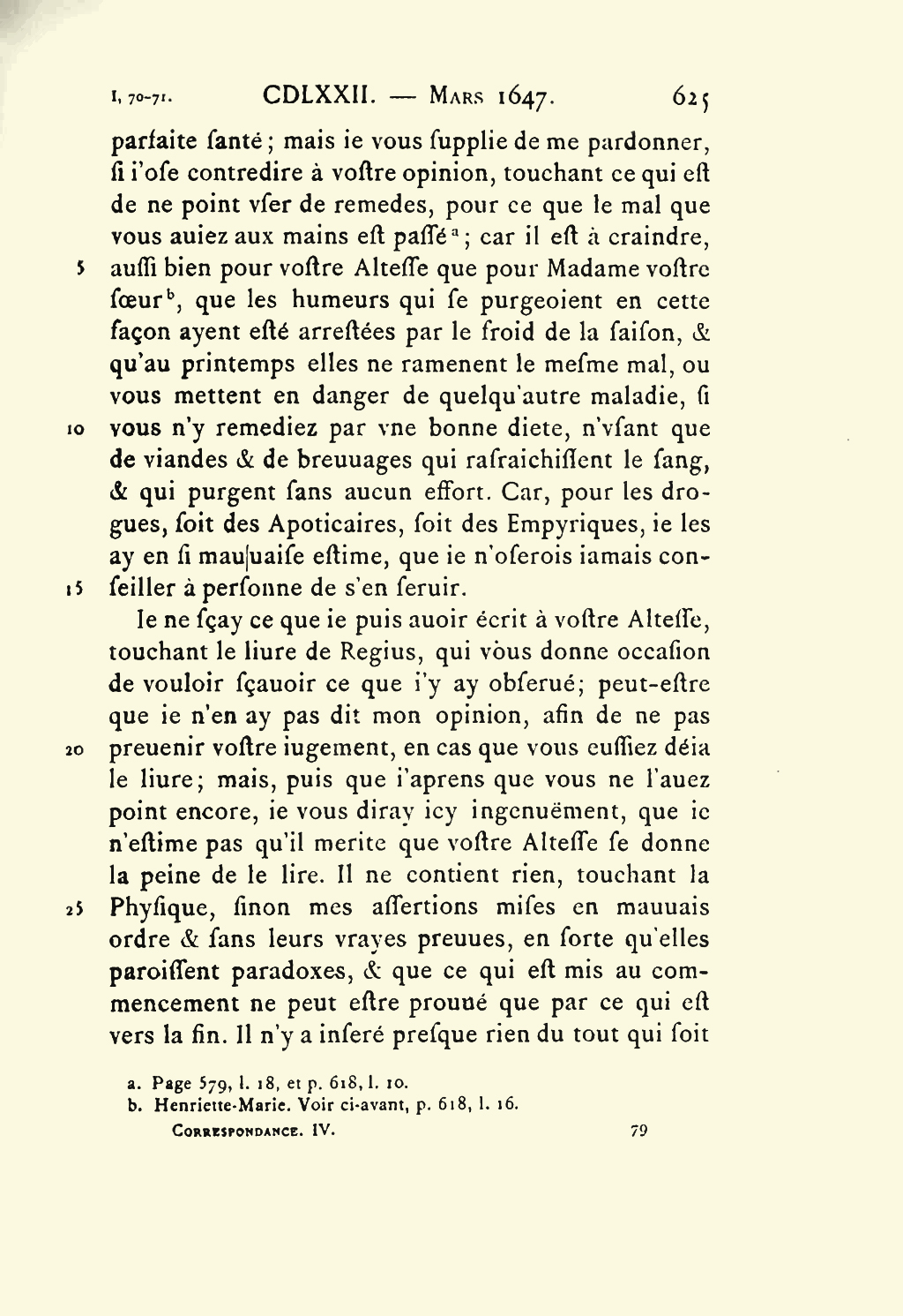 parfaite santé ; mais ie vous supplie de me pardonner si i’ose contredire à vostre opinion, touchant ce qui est de ne point user de remedes, pour ce que le mal que vous aviez aux mains est passé ; car il est à craindre aussi bien pour vostre Altesse, que pour Madame vostre Sœur, que les humeurs qui se purgeoient en cette façon ayent esté arrestées par le froid de la saison, et qu’au Printemps elles ne ramenent le mesme mal, ou vous mettent en danger de quelqu’autre maladie, si vous n’y remediez par une bonne diete, n’usant que de viandes et de breuvages qui rafraichissent le sang, et qui purgent sans aucun effort. Car pour les drogues, soit des Apoticaires, soit des Empyriques, ie les ay en si mau Clerselier I, 71
