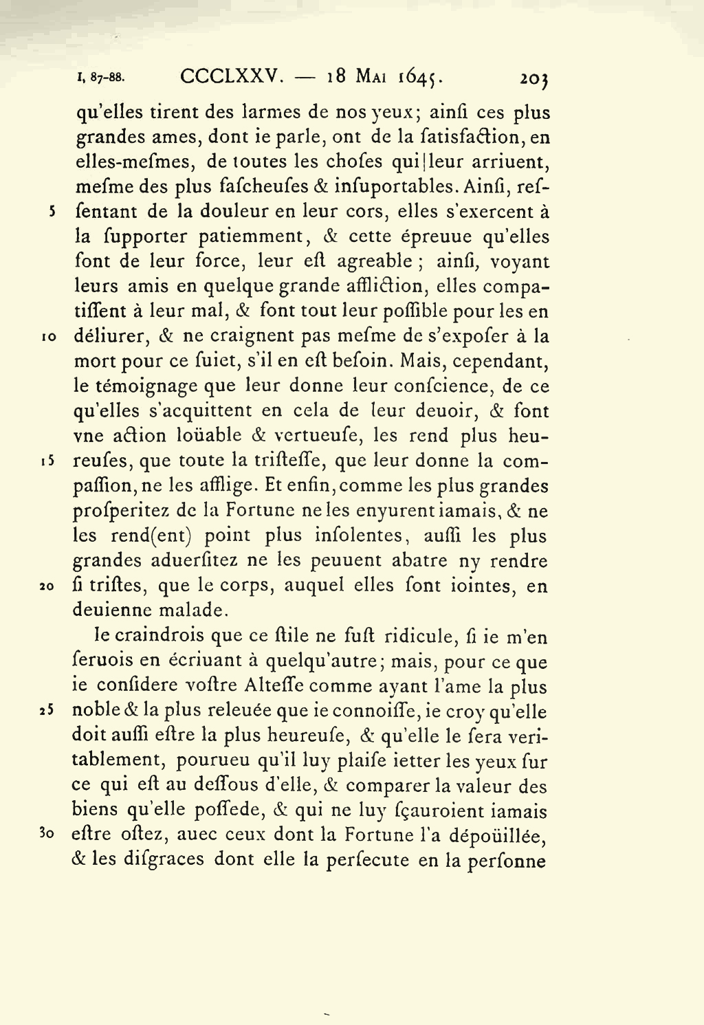en mesme estat ; Mais j’ay apris par ses dernieres que vostre Altesse a eu trois ou quatre semaines durant une fiévre lente, acompagnée d’une toux seiche, et qu’apres en avoir esté délivrée pour cinq ou six jours, le mal est retourné, et que toutesfois au temps qu’il m’a envoyé sa lettre (laquelle a esté prés de quinze iours par les chemins) vostre Altesse commençoit derechef à se porter mieux. En quoy ie remarque les signes d’un mal si considerable, et neantmoins auquel il me semble que vostre Altesse peut si certainement remedier, que ie ne puis m’abstenir de luy en écrire mon sentiment. Car bien que ie ne sois pas Medecin, l’honneur que vostre Altesse me fit l’Esté passé, de vouloir sçavoir mon opinion touchant une autre indisposition qu’elle avoit pour lors, me fait esperer que ma liberté ne luy sera pas desagreable. La cause la plus ordinaire de la fiévre lente est la tristesse ; et l’opiniastreté de la Fortune à persecuter vostre maison vous donne continuellement des sujets de fascherie, qui sont si publics et si éclatans, qu’il n’est pas besoin d’user beaucoup de conjectures, ny estre fort dans les affaires pour juger que c’est en cela que consiste la principale cause de vostre indisposition ; Et il est à craindre que vous n’en puissiez estre du tout délivrée, si ce n’est que par la force de Clerselier I, 87