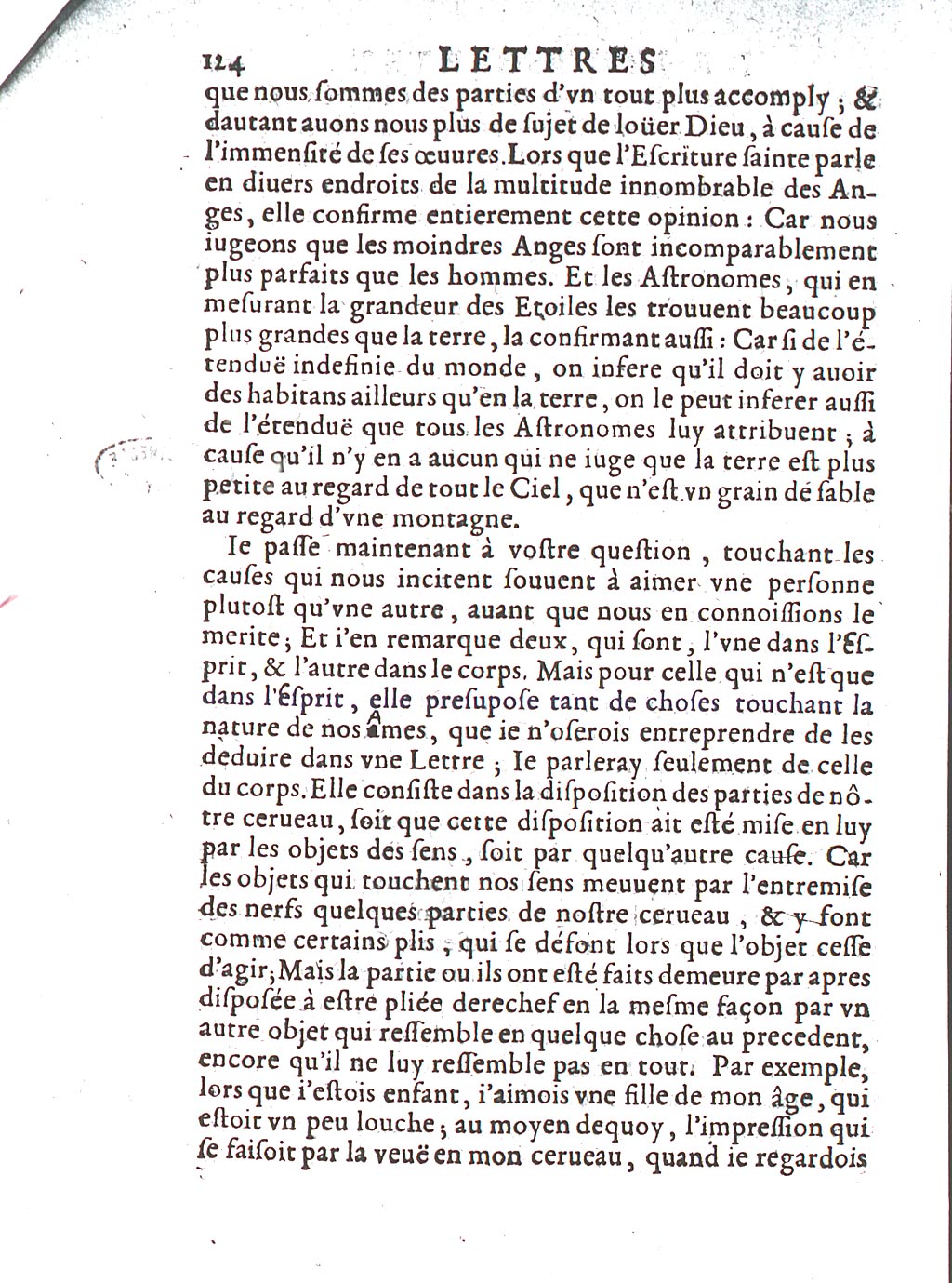 Ie passe maintenant à vostre question, touchant les causes qui nous incitent souvent à aimer une personne plutost qu’une autre, avant que nous en connoissions le merite ; Et i’en remarque deux, qui sont, l’une dans l’esprit, et l’autre dans le corps. Mais pour celle qui n’est que dans l’esprit, elle presuppose tant de choses touchant la nature de nos ames, que ie n’oserois entreprendre de les deduire dans une Lettre ; Ie parleray seulement de celle du corps. Elle consiste dans la disposition AT V, 57