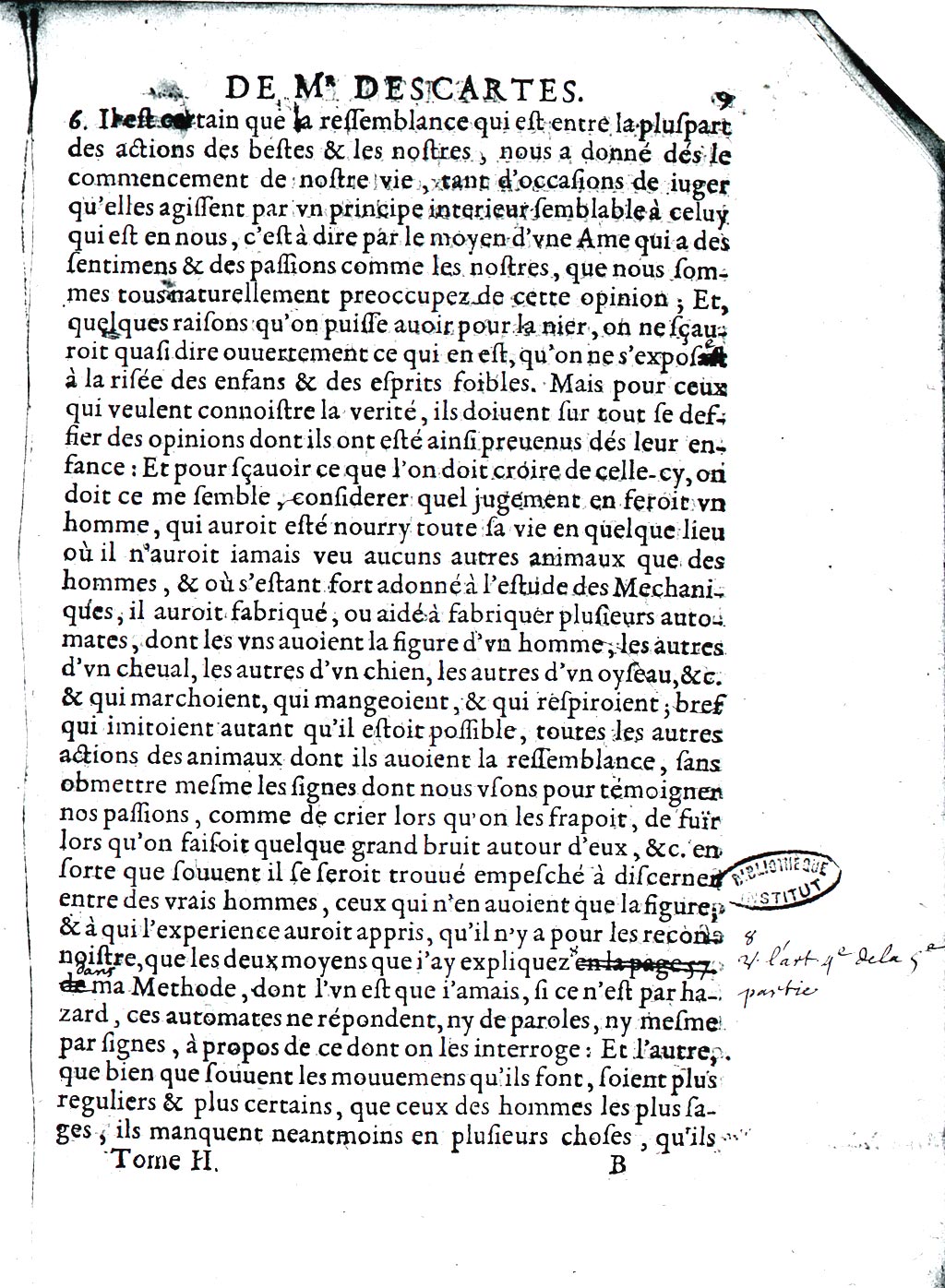 6. Il est certain que la ressemblance qui est entre la pluspart des actions des bestes et les nostres, nous a donné dés le commencement de nostre vie, tant d’occasions de iuger qu’elles agissent par un principe interieur semblable à celuy qui est en nous, c’est à dire par le moyen d’une Ame qui a des sentimens et des passions comme les nostres, que nous sommes tous naturellement preoccupez de cette opinion ; Et, quelques raisons qu’on puisse avoir pour la nier, on ne sçauroit quasi dire ouvertement ce qui en est, qu’on ne s’exposast à la risée des enfans et des esprits foibles. Mais pour ceux qui veulent connoistre la verité, ils doivent sur tout se deffier des opinions dont ils ont esté ainsi prevenus dés leur enfance : Et pour sçavoir ce que l’on doit croire de celle-cy, on doit ce me semble, considerer quel jugement en feroit un homme, qui auroit esté nourry toute sa vie en quelque lieu où il n’auroit iamais veu aucuns autres animaux que des hommes, et où s’estant fort adonné à l’estude des Mechaniques, il auroit fabriqué, ou aidé à fabriquer plusieurs automates, dont les uns avoient la figure d’un homme, les autres d’un cheval, les autres d’un chien, les autres d’un oyseau, etc. et qui marchoient, qui AT II, 40