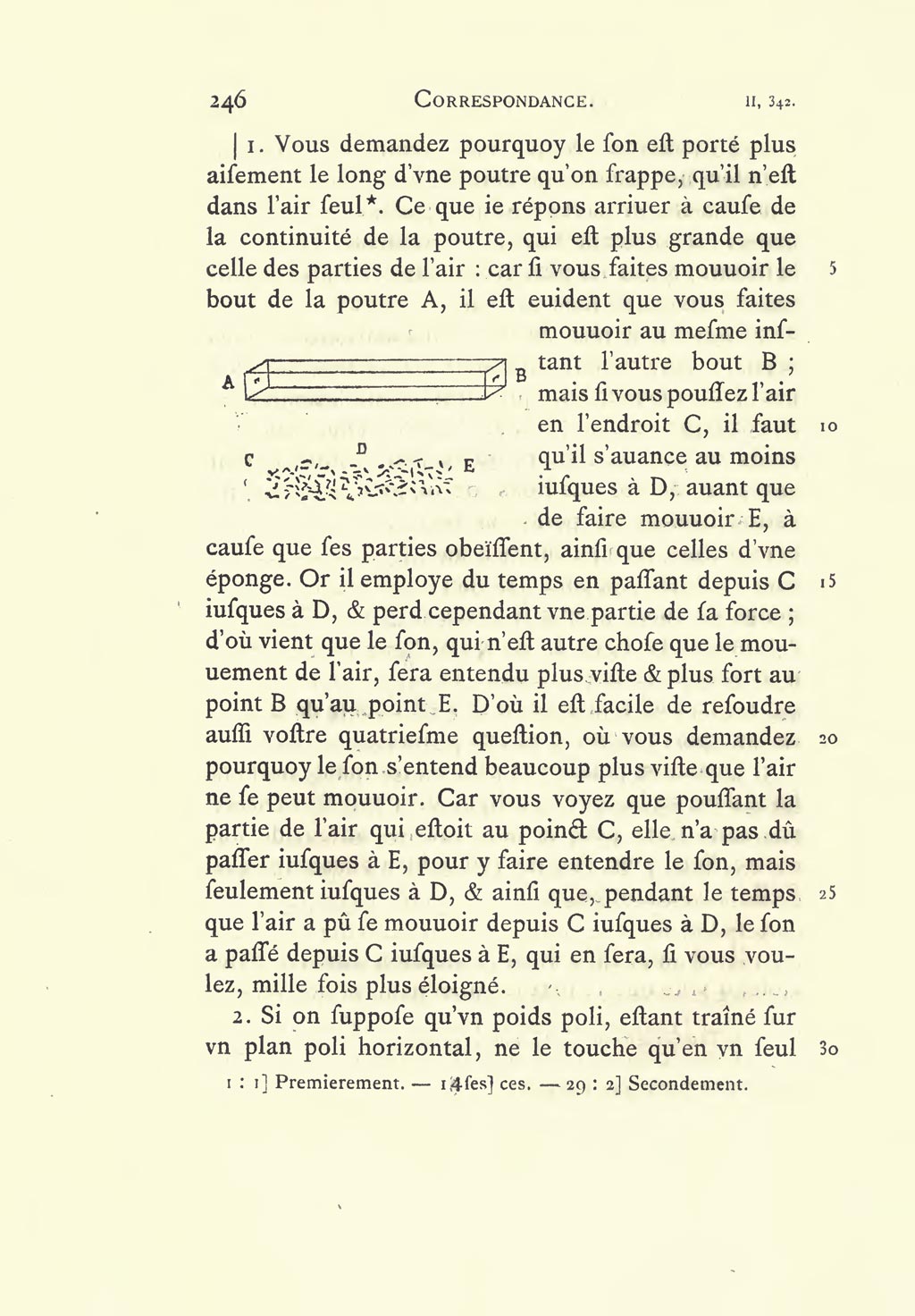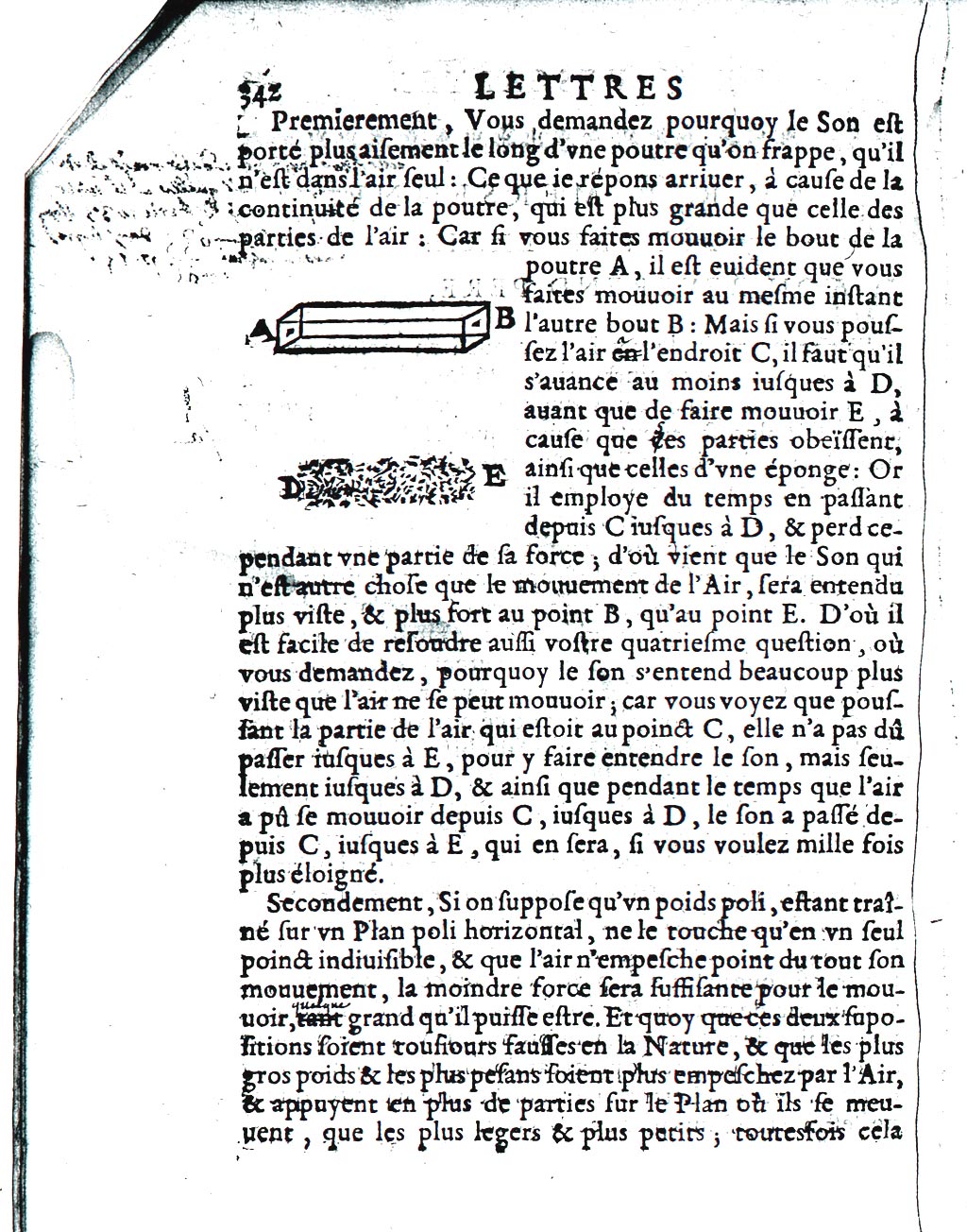 poutre A, il est evident que vous faites mouvoir au mesme instant l’autre bout B : Mais si vous poussez l’air en l’endroit C, il faut qu’il s’avance au moins iusques à D, avant que de faire mouvoir E, à cause que ces parties obeïssent, ainsi que celles d’une éponge : Or il employe du temps en passant depuis C iusques à D, et perd cependant une partie de la force ; d’où vient que le Son qui n’est autre chose que le mouvement de l’Air, sera entendu plus viste, et plus fort au point B, qu’au point E. D’où il est facile de resoudre aussi votre quatriesme question, où vous demandez pourquoy le son s’entend beaucoup plus viste que l’air ne se peut mouvoir ; car vous voyez que poussant la partie de l’air qui estoit au poinct C, elle n’a pas dû passer iusques à E, pour y faire entendre le son, mais seulement iusques à D, et ainsi que pendant le temps que l’air a pû se mouvoir depuis C, iusques à D, le son a passé depuis C, iusques à E, qui en sera, si vous voulez mille fois plus éloigné.
