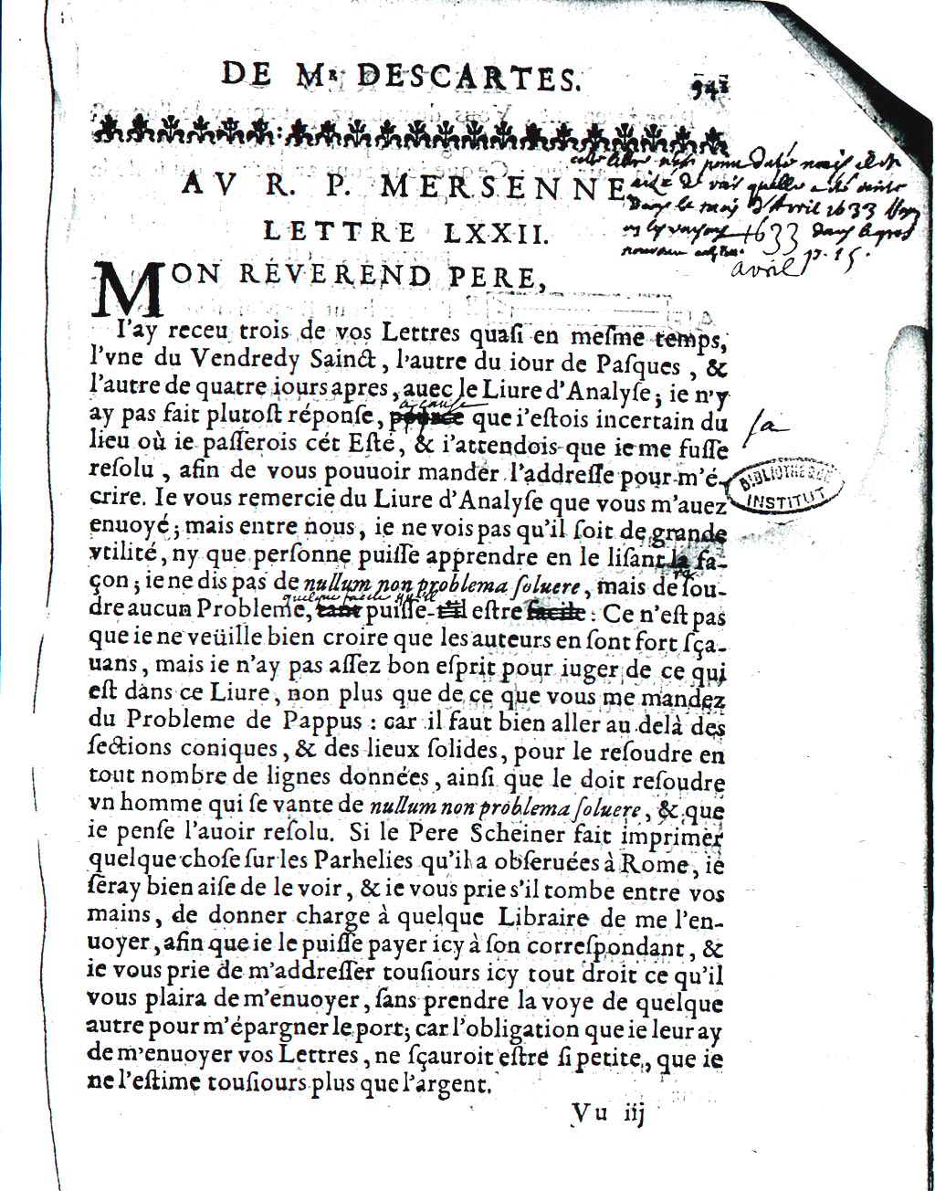 l’une du Vendredy Sainct, l’autre du iour de Pasques, et l’autre de quatre iours apres, avec le Livre d’Analyse ; ie n’y ay pas fait plutost réponse, pource que i’estois incertain du lieu où ie passerois cét Esté, et i’attendois que ie me fusse resolu, afin de vous pouvoir mander l’addresse pour m’écrire. Ie vous remercie du Livre d’Analyse que vous m’avez envoyé ; mais entre nous, ie ne vois pas qu’il soit de grande utilité, ny que personne puisse apprendre en le lisant la façon ; ie ne dis pas de nullum non problema solvere, mais de soudre aucun Probleme, tant puisse-t’il estre facile. Ce n’est pas que ie ne veüille bien croire que les auteurs en sont fort sçavans, mais ie n’ay pas assez bon esprit pour iuger de ce qui est dans ce Livre, non plus que de ce que vous me mandez du Probleme de Pappus : car il faut bien aller au delà des sections coniques, et des lieux solides, pour le resoudre en tout nombre de lignes données, ainsi que le doit resoudre un homme qui se vante de nullum non problema solvere, et que ie pense l’avoir resolu. Si le Pere Scheiner fait imprimer quelque chose sur les Parhelies qu’il a observées à Rome, ie seray bien aise de le voir, et ie vous prie s’il tombe entre vos mains, de donner charge à quelque Libraire de me l’envoyer, afin que ie le puisse payer icy à son correspondant, et ie vous prie de m’addresser tousiours icy tout droit ce qu’il vous plaira de m’envoyer, sans prendre la voye de quelque autre pour m’épargner le port ; car l’obligation que je leur ay de m’envoyer vos Lettres, ne sçaurait estre si petite, que ie ne l’estime tousiours plus que l’argent.