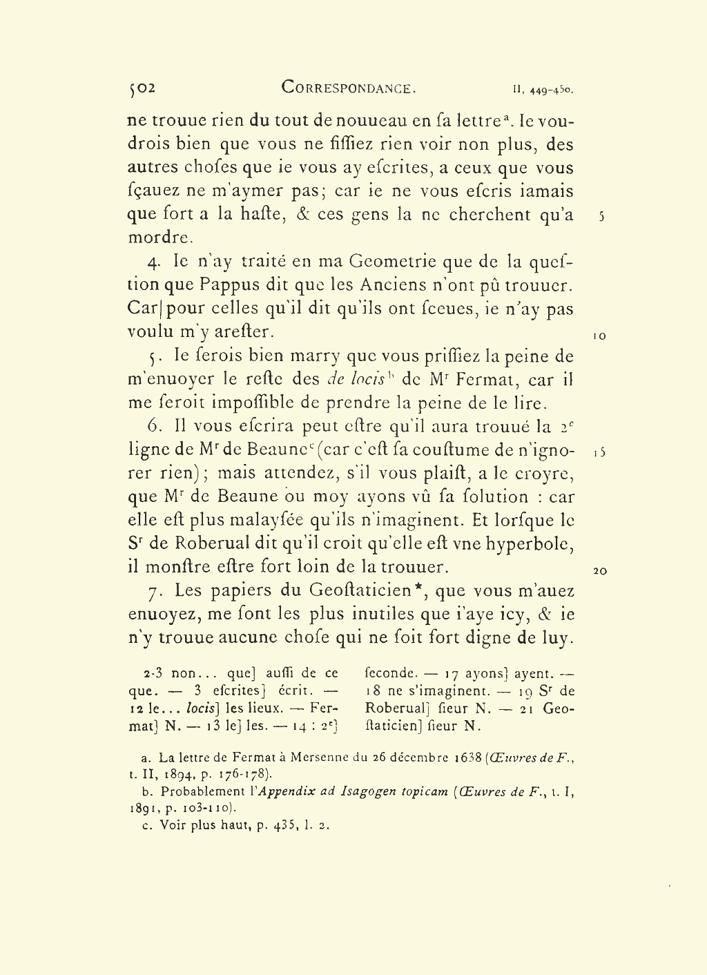 Ne vous mettez pas en peine de cét Isagoge ad locos planos et solidos, que vous m’avez envoyé, car ie donne tous ces lieux en ma Geometrie au second Livre, en y construisant la question de Pappus, comme i’ay averty en la page 334. et ceux qui y cherchent quelque autre chose, monstrent par là qu’ils ne les entendent point.