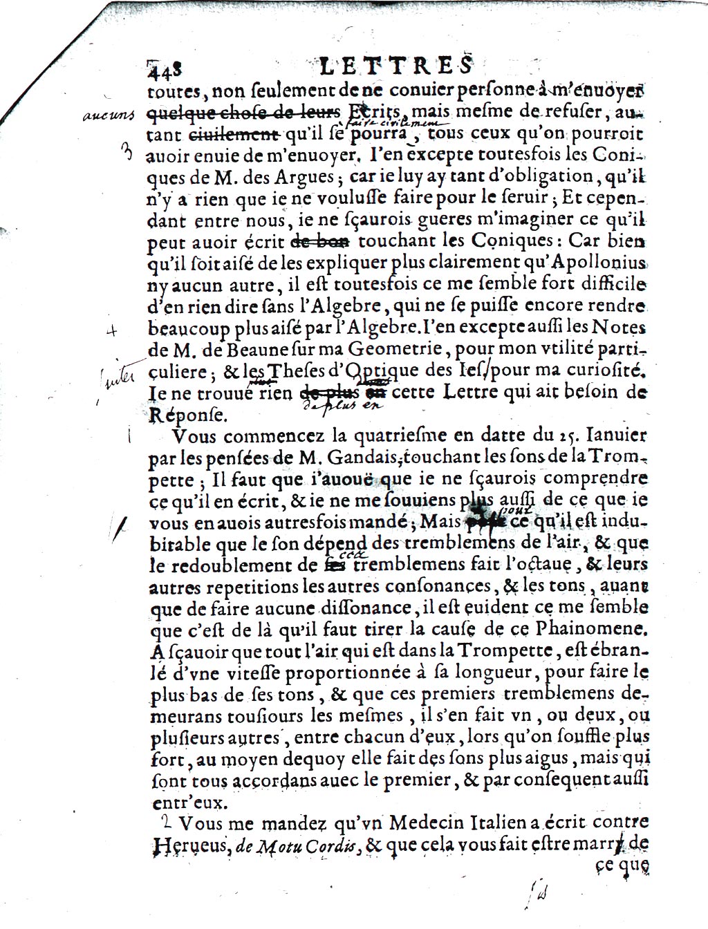 Puis qu’il vous plaist que ie réponde encore à vos dernieres, ie m’en va relire aussi vos precedentes, afin de n’en laisser aucune sans réponse. En la Lettre qui est du premier iour de l’An, vous me décrivez ce qu’on vous a dit des Lunettes de Naples, ce qui me donne grande raison de iuger qu’elles sont hyperboliques. Et il n’est point besoin pour cela que l’ouvrier ait vû ma Dioptrique ; car l’invention en ayant esté communiquée à M. F. et à quelques-autres il y a plus de douze ans, ce ne seroit pas merveille que quelqu’un d’eux l’eust fait passer iusques à Naples. Quoy qu’il en soit, ie serois tres-aise que ce qu’on vous en a dit fust veritable : Mais les Sçavans d’Italie sont fort sujets à AT II, 494