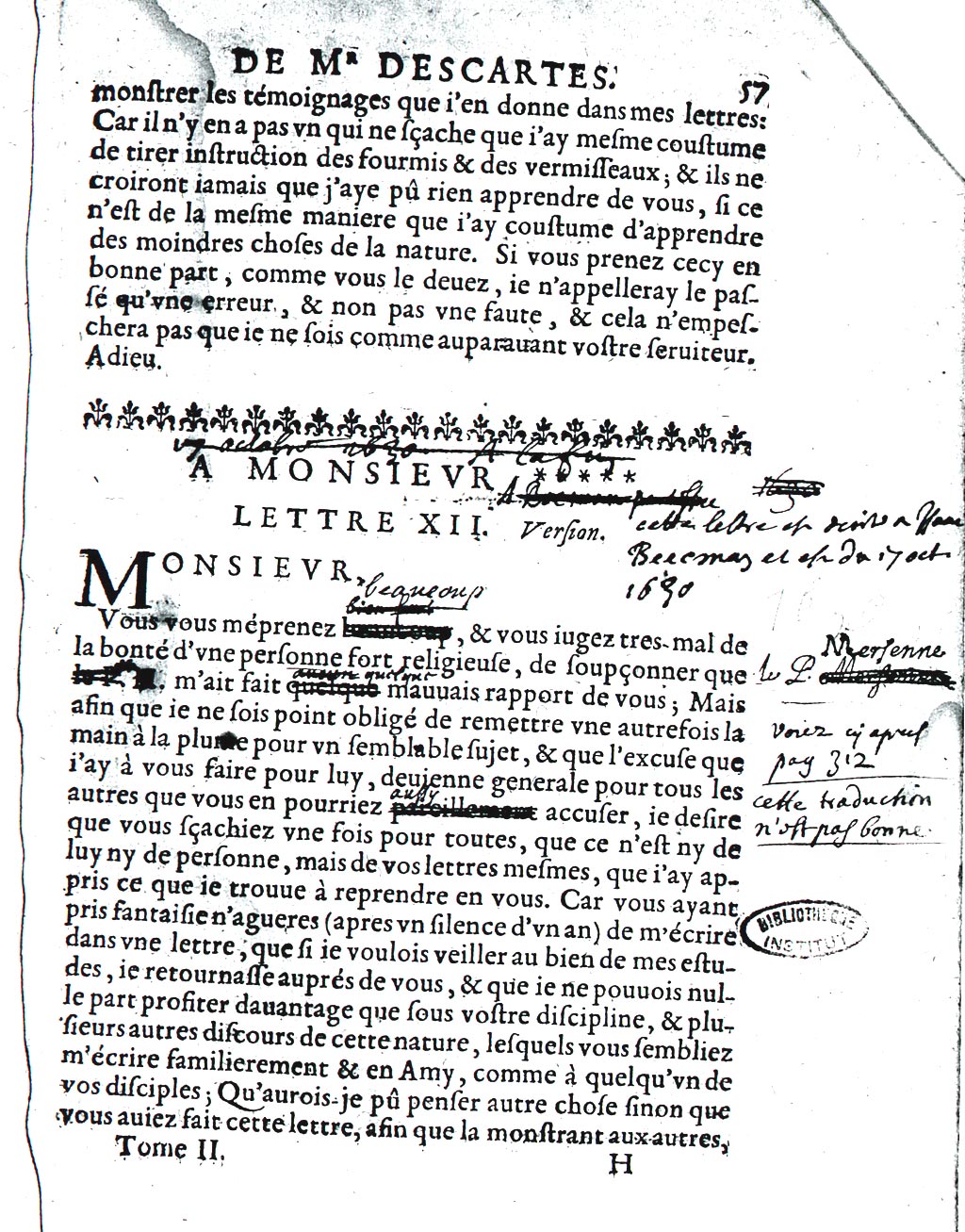 Ie vous redemanday l’année passée mon Traitté de Musique, non pas à la verité que i’en eusse besoin, mais pource qu’on m’avoit dit que vous en parliez, comme si vous me l’eussiez apprise ; Toutefois ie ne voulus point vous en écrire aussi-tost, de peur de paroistre trop défiant , si ie doutois de la fidelité d’un Amy sur le simple rapport d’autruy. Mais maintenant que par plusieurs autres témoignages i’ay reconnu que vous preferez une vaine ostentation à la verité, et à l’Amitié qui a esté iusques icy entre nous ; ie veux vous donner icy un petit mot d’Avis, qui est, que si vous vous vantez d’avoir enseigné quelque chose à quelqu’un, encore que ce que vous dites soit veritable, cela ne laisse pas d’estre odieux ; mais si ce que vous dites est contre la verité, il est encore plus odieux ; Et enfin si vous avez appris de luy la chose mesme que vous vous vantez luy avoir apprise, certainement cela est tout à fait odieux. Mais sans doute que la civilité du stile François vous a trompé, et que vous ayant souvent témoigné de bouche et par écrit, que i’avois appris plusieurs choses de vous, et que i’esperois mesme encore tirer beaucoup de profit de vos observations, vous n’avez point crû me faire tort de confirmer par vos discours une chose que ie ne faisois point difficulté de publier moy-mesme : Quant à moy, ie me soucie fort peu de tout cela ; mais la defference que j’ay encore pour nostre ancienne amitié m’oblige a vous avertir que lors que vous vous vantez de quelque chose de semblable devant ceux qui me connoissent, cela nuit beaucoup à vostre reputation : Car ne pensez pas qu’ils croyent rien de tout ce que vous leur dites, mais croyez plustost qu’ils se moquent de vostre Vanité ; Et il ne vous sert de rien de leur Clerselier II, 57