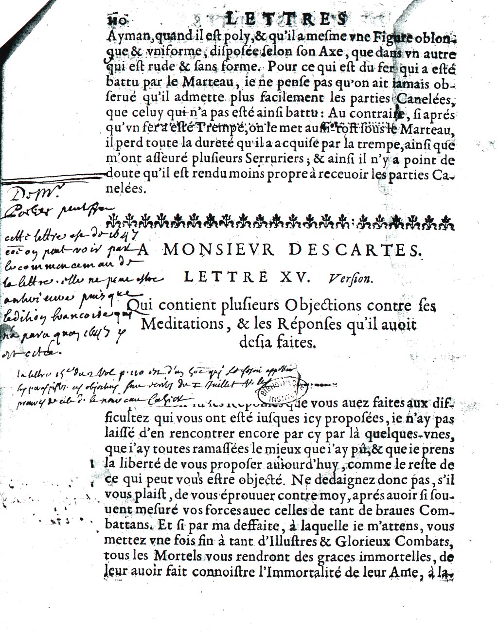 Ie laisse la premiere Objection, pource qu’il dit avoir dèja esté entierement satisfait par M. Picot.