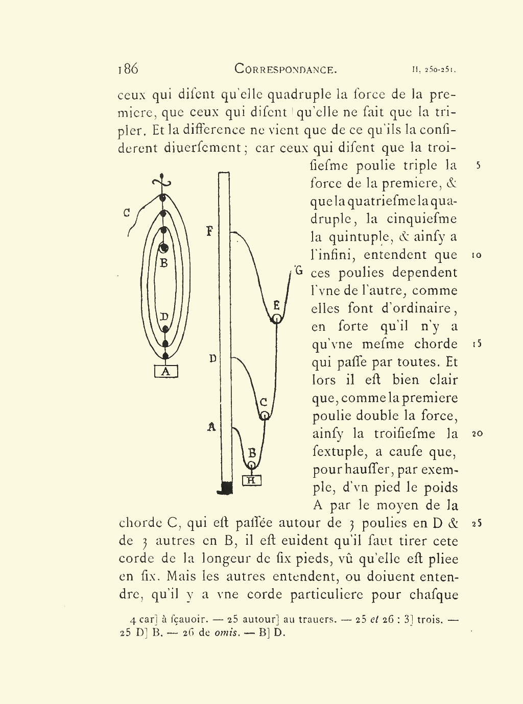 qu’elle ne fait que la tripler ; Et la difference ne vient que de ce qu’ils la considerent diversement ; à sçavoir, ceux qui disent que la troisiéme Poulie triple la force de la premiere, et que la quatriéme la quadruple, la cinquiéme la quintuple, et ainsi à l’infiny, entendent que ces Poulies dependent l’une de l’autre, comme elles font d’ordinaire, en sorte qu’il n’y a qu’une mesme corde, qui passe par toutes ; Et alors il est bien clair que comme la premiere Poulie double la force, ainsi la troisiéme la sextuple, à cause que pour hausser, par exemple, d’un pié le poids A, par le moyen de la corde C, qui est passée au travers de trois Poulies, en B, et trois autres en D, il est evident qu’il faut tirer cette corde de la longueur de six piez, veu qu’elle est pliée en six. Mais les autres entendent, ou doivent entendre, qu’il y a une corde particuliere pour chaque AT III, 187