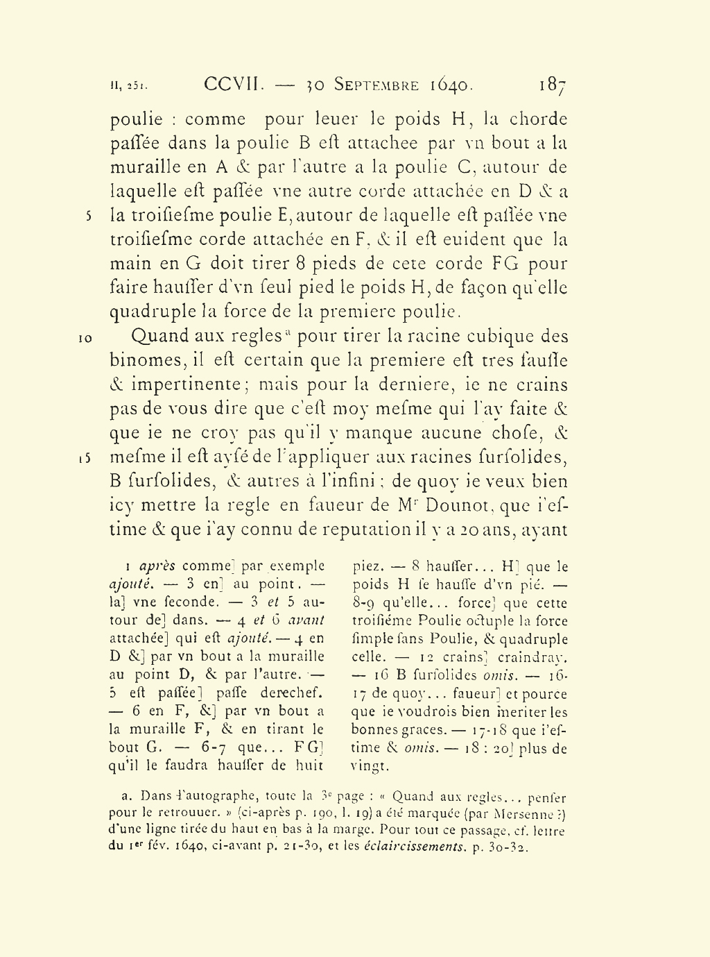 dont la Racine se puisse tirer telle que ce soit, sinon ceux qui, soit du premier coup, soit du moins apres avoir esté multipliez ou divisez par quelque nombre, ont l’une de leurs parties Rationnelle, et dont l’autre partie est la Racine quarrée d’un nombre Rationel ; si bien qu’il est seulement besoin de parler de ceux-cy. Et il faut tirer la racine (Notez que par tout où ie mets la racine sans dire Quarrée ou Cubique etc. il faut entendre celle qui est de mesme denomination que celle qu’on cherche ; Et pour racine Cubique i’écris √3. pour racine Sursolide, que d’autred’autres nomment quarré de cube, i’écris √5, et ainsi des autres) il faut dis-je tirer la racine de la difference qui est entre les quarrez de leurs parties, si elle est Rationelle, ou si elle ne l’est pas, il faut multiplier AT III, 189
