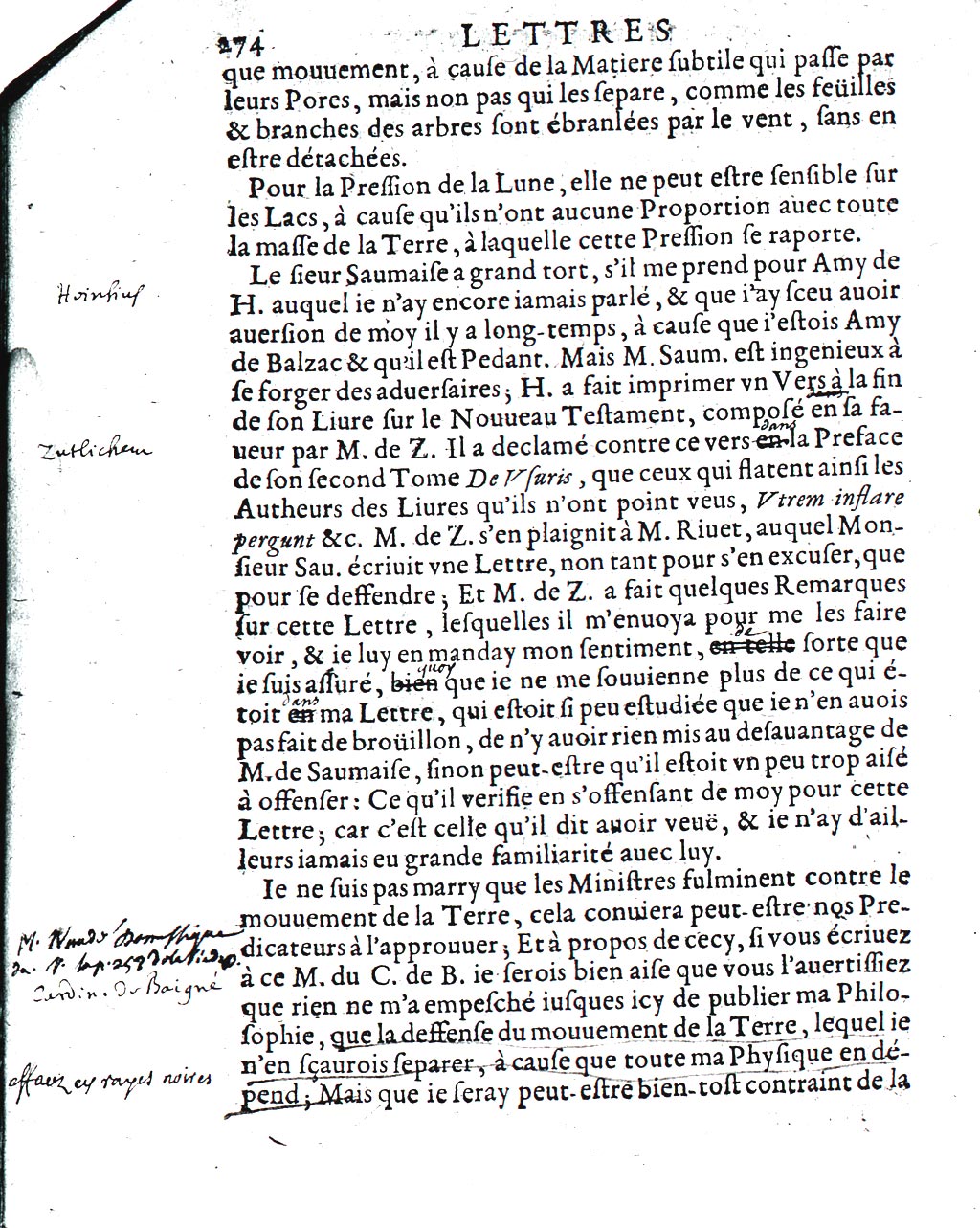 Le sieur Saumaise a grand tort, s’il me prend pour Amy de H. auquel ie n’ay encore iamais parlé, et que i’ay sceu avoir aversion de moy il y a long-temps, à cause que i’estois Amy de Balzac et qu’il est Pedant. Mais M. Saum. est ingenieux à se forger des adversaires ; H. a fait imprimer un Vers à la fin de son Livre sur le Nouveau Testament, composé en sa faveur par M. de Z. Il a declamé contre ce vers en la Preface de son second Tome De Usuris, que ceux qui flatent ainsi les Autheurs des Livres qu’ils n’ont point veus, Utrem inflare pergunt etc. M. de Z. s’en plaignit à M. Rivet, auquel Monsieur Sau. écrivit une Lettre, non AT III, 258