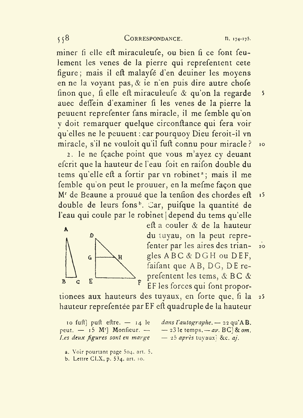 dépend du temps qu’elle est à couler. Et de la hauteur du Tuyau, on la peut representer par les Aires des Triangles ABC, et DGH, ou DEF, faisant qu’ AB, DG, DE, representent les Temps, BC, et EF, les Forces qui sont proportionnées aux hauteurs des Tuyaux, etc. En sorte que si la hauteur representée par EF, est quadruple de la hauteur AT II, 559