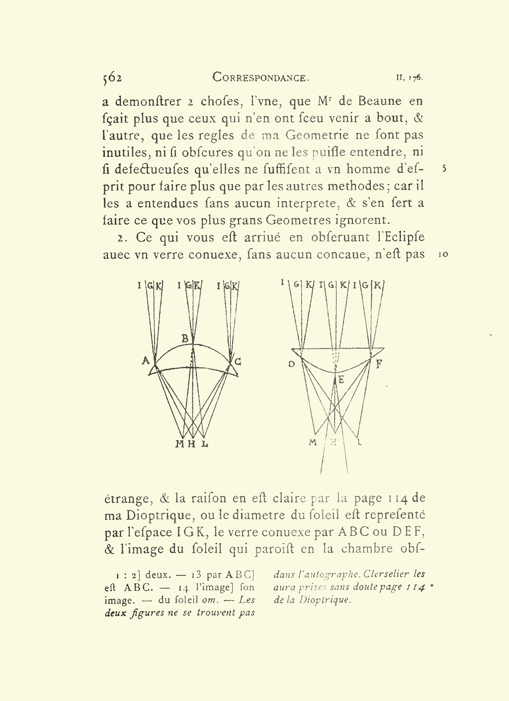 Ce qui vous est arrivé en observant l’Eclypse avec un Verre Convexe, sans aucun Concave n’est pas estrange, et la raison en est claire par la page 114. de ma Dioptrique, où le Diametre du Soleil est representé par l’Espace IGK, le Verre Convexe est ABC, ou DEF, et son Image qui paroist en la Chambre obscure AT II, 563