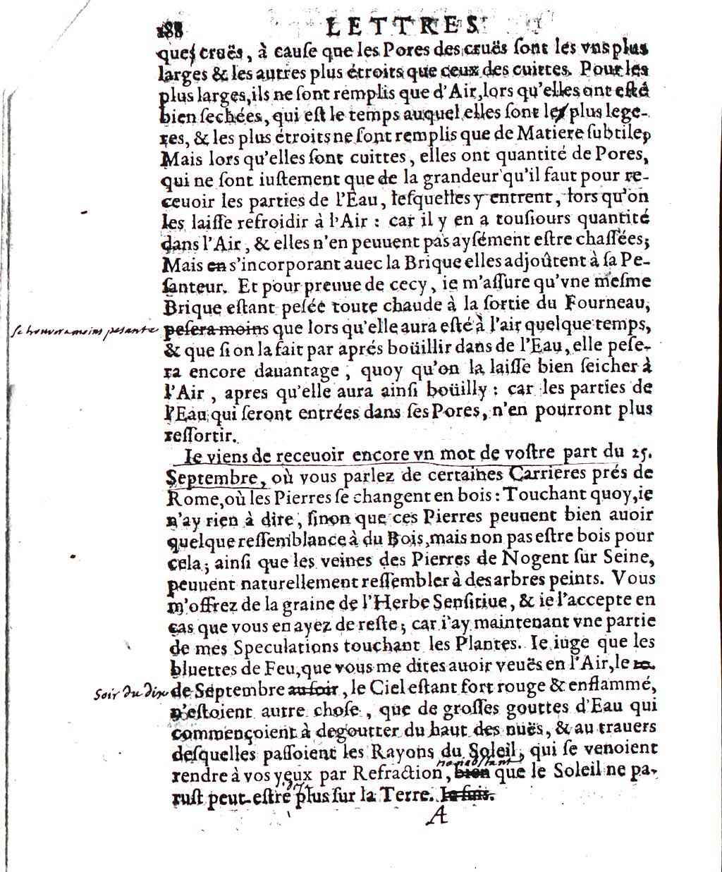 Ie viens de recevoir encore un mot de vostre part du 25. Septembre, où vous parlez de certaines Carrieres prés de Rome, où les Pierres se changent en bois : Touchant quoy, ie n’ay rien à dire, sinon que ces Pierres peuvent bien avoir quelque ressemblance à du Bois, mais non pas estre bois pour cela ; ainsi que les veines des Pierres de Nogent sur Seine, peuvent naturellement ressembler à des arbres peints. Vous m’offrez de la graine de l’Herbe Sensitive, et ie l’accepte en cas que vous en ayez de reste ; car i’ay maintenant une partie de mes Speculations touchant les Plantes. Ie iuge que les bluettes de Feu, que vous dites avoir veuës en l’Air, le 10. de Septembre au soir, le Ciel estant fort rouge et enflammé, n’estoient autre chose, que de grosses gouttes d’Eau qui commençoient à degoutter du haut des nuës, et au travers desquelles passoient les Rayons du Soleil, qui se venoient rendre à vos yeux par Refraction, bien que le Soleil ne parust peut-estre plus sur la Terre. Ie suis.