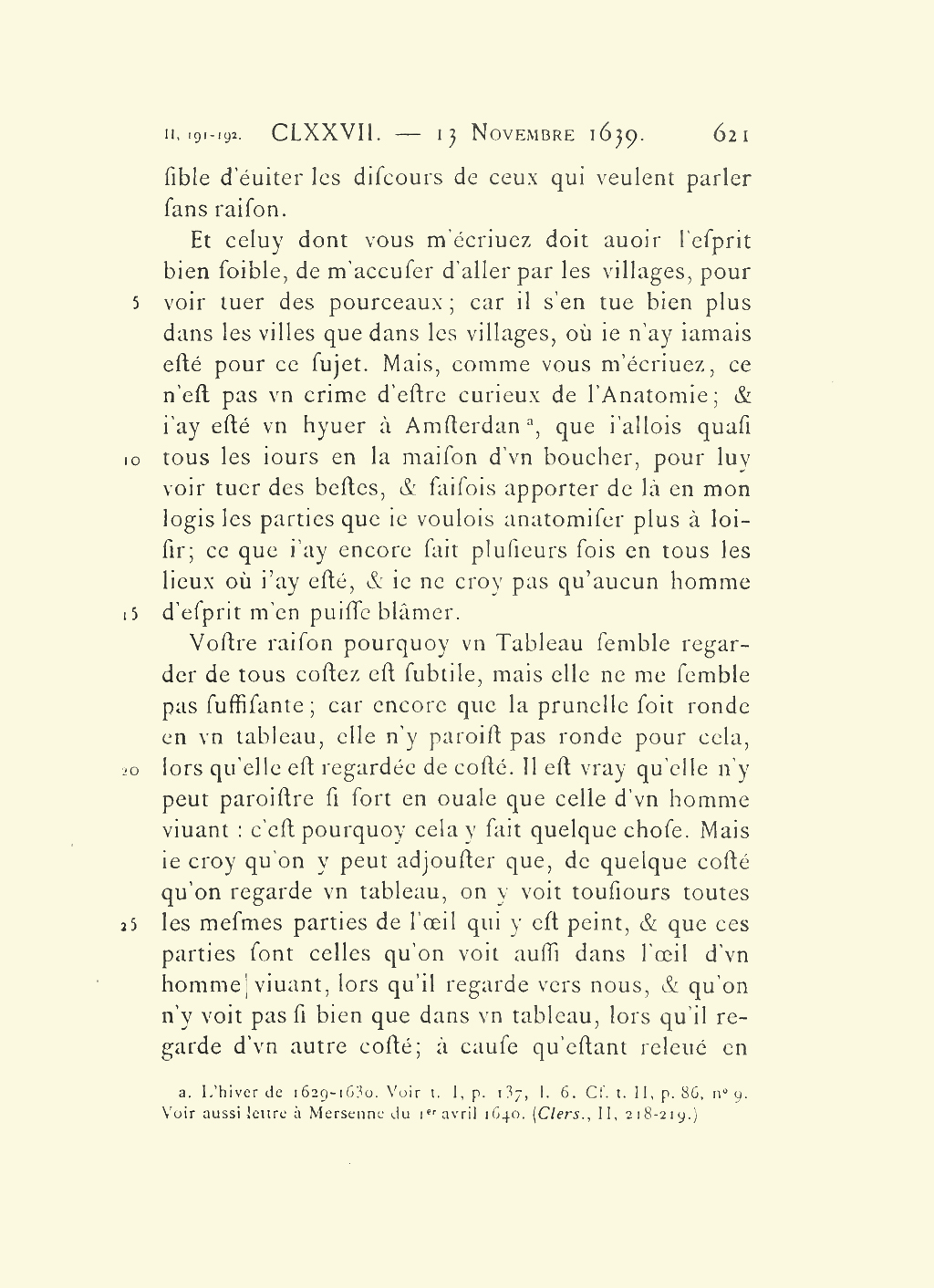 d’éviter les discours de ceux qui veulent parler sans raison ; Et celuy dont vous m’écrivez doit avoir l’Esprit bien foible, de m’accuser d’aller par les Villages, pour voir tuer des Pourceaux ; car il s’en tuë bien plus dans les Villes que dans les Villages, où ie n’ay iamais esté pour ce sujet ; Mais comme vous m’écrivez, ce n’est pas un crime d’estre curieux de l’Anatomie ; et i’ay esté un Hyver à Amsterdam, que i’allois quasi tous les iours en la maison d’un Boucher, pour luy voir tuer des Bestes, et faisois apporter de là en mon logis, les Parties que ie voulois anatomiser plus à loisir ; ce que i’ay encore fait plusieurs fois en tous les lieux où i’ay esté, et ie ne croy pas qu’aucun homme d’esprit m’en puisse blâmer.
