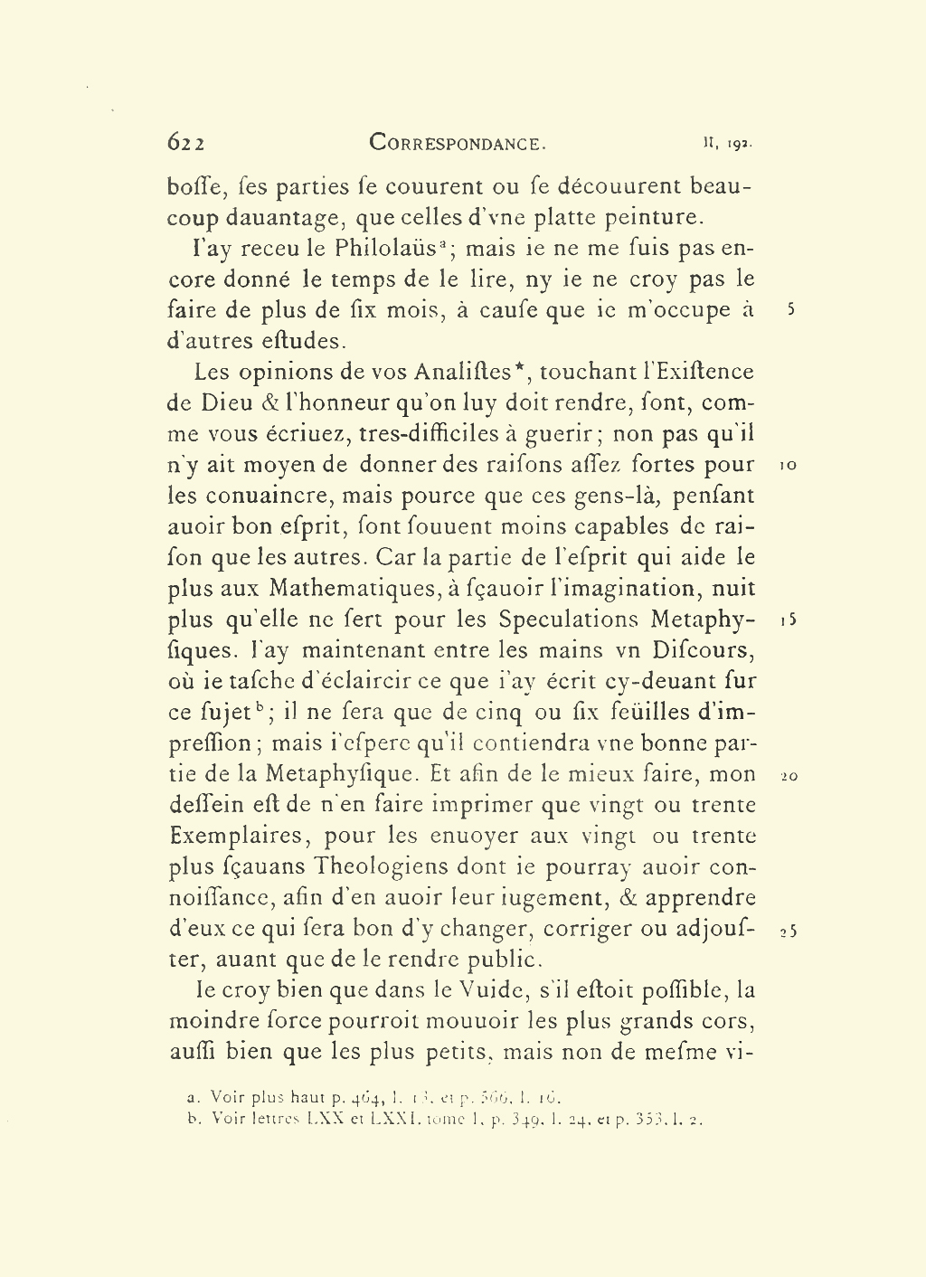Les opinions de vos Analistes, touchant l’Existence de Dieu, et l’honneur qu’on luy doit rendre, sont comme vous écrivez, tres difficiles à guerir, non pas qu’il n’y ait moyen de donner des raisons assez fortes pour les convaincre, mais pource que ces gens-là, pensant avoir bon esprit, sont souvent moins capables de raison que les autres : Car la partie de l’Esprit qui aide le plus aux Mathematiques, à sçavoir l’Imagination, nuit plus qu’elle ne sert, pour les Speculations Metaphysiques. I’ay maintenant entre les mains un Discours, où ie tasche d’éclaircir ce que i’ay écrit cy-devant sur ce sujet ; il ne sera que de cinq ou six feüilles d’impression ; mais i’espere qu’il contiendra une bonne partie de la Metaphysique : Et afin de le mieux faire, mon dessein est de n’en faire imprimer que vingt ou trente Exemplaires, pour les envoyer aux vingt ou trente plus Sçavans Theologiens, dont ie pourray avoir connoissance, afin d’en avoir leur iugement, et apprendre d’eux ce qui sera bon d’y changer, corriger, ou adjouster, avant que de le rendre public.