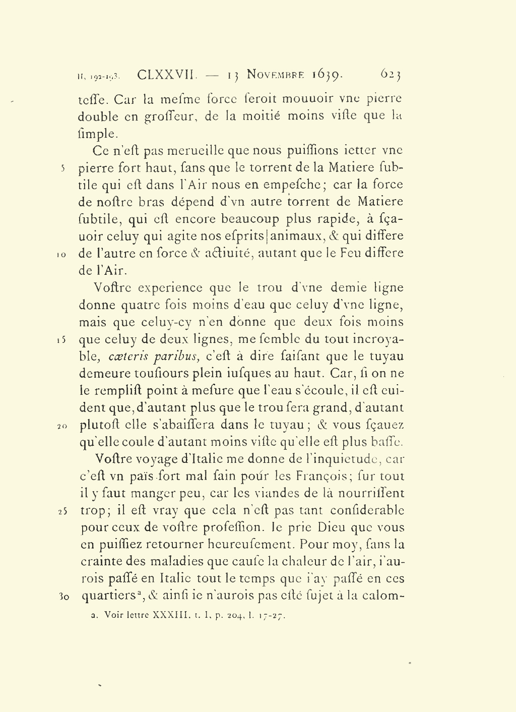 Vostre voyage d’Italie me donne de l’inquietude, car c’est un païs fort mal sain pour les François ; sur tout il y faut manger peu, car les viandes de là nourrissent trop ; il est vray que cela n’est pas tant considerable pour ceux de vostre profession ; Ie prie Dieu que vous en puissiez retourner heureusement. Pour moy, sans la crainte des maladies que cause la chaleur de l’Air, i’aurois passé en Italie tout le temps que i’ay passé en ces quartiers, et ainsi ie n’aurois pas esté sujet à la calomnie AT II, 624
