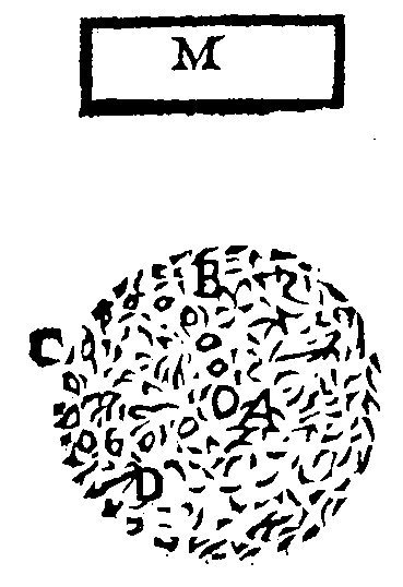 A, une Pierre, autour de laquelle ie suppose qu’il n’y a que de l’Air, et que les parties de cét Air se meuvent continuellement, non toutes d’un mesme costé, comme lors qu’il fait vent, car ce n’est pas cela qui le rend liquide, mais en divers Sens ; ou mesme, afin d’avoir mieux sur quoy arrester son Imagination, on peut penser que chacune de ses parties tournoye en rond, dans l’endroit où elle est, et pensons que cette Pierre est poussée d’A vers M, il est evident qu’elle n’aura aucune difficulté à continuer son mouvement vers là ; bien que pour le faire, elle doive chasser devant soy les parties d’Air qui sont vers B, et celles-cy les parties qui sont vers C, et celles qui sont AT III, 77