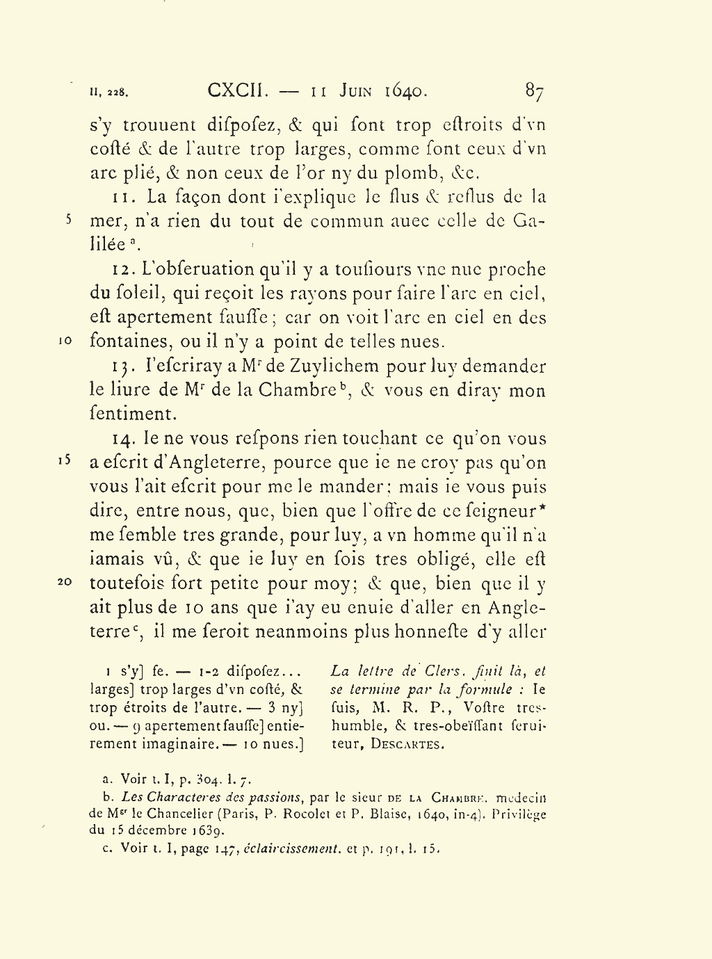 se trouvent trop larges d’un costé, et trop étroits de l’autre, comme sont ceux d’un Arc plié, et non ceux de l’Or ou du Plomb, etc. La façon dont i’explique le flus et reflus de la Mer, n’a rien du tout de commun avec celle de Galilée. L’observation qu’il y a tousiours une nuë proche du Soleil, qui reçoit les rayons pour faire l’Arc-en-Ciel, est entierement imaginaire, car on voit l’Arc-en-Ciel en des Fontaines, où il n’y a point de telles nuës. AT III, 88
