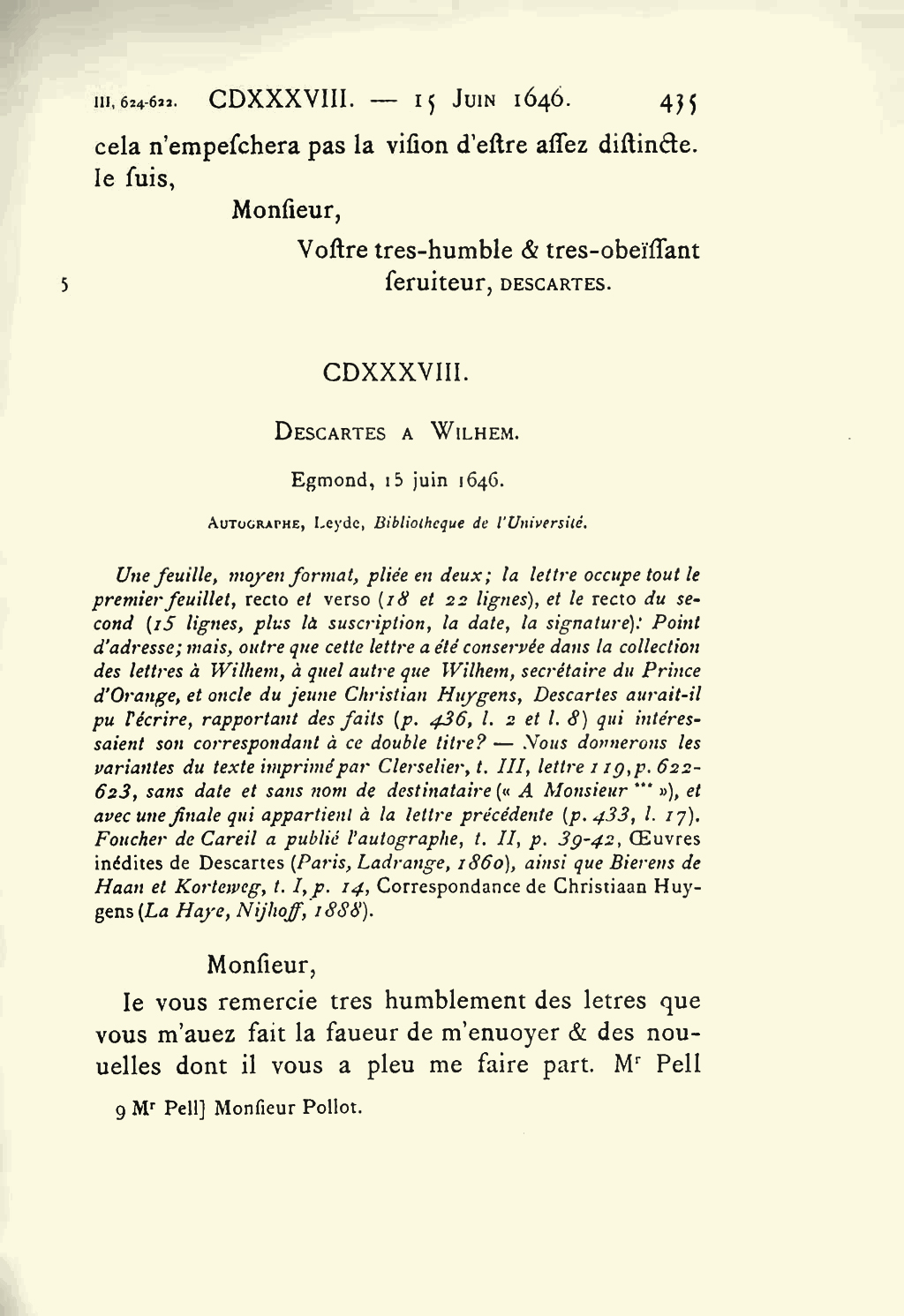 Ie vous remercie tres humblement des Lettres que vous m’avez fait la faveur de m’envoyer, et des nouvelles dont il vous a plû me faire part. Monsieur Pollot AT IV, 436