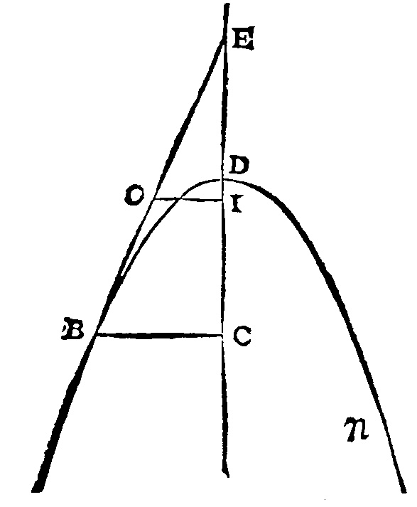 qui rencontre DC au point E, et qui soit la plus grande qu’on puisse tirer du mesme point E iusques à la parabole, (à sçavoir au dehors de cette parabole, Clerselier III, 329