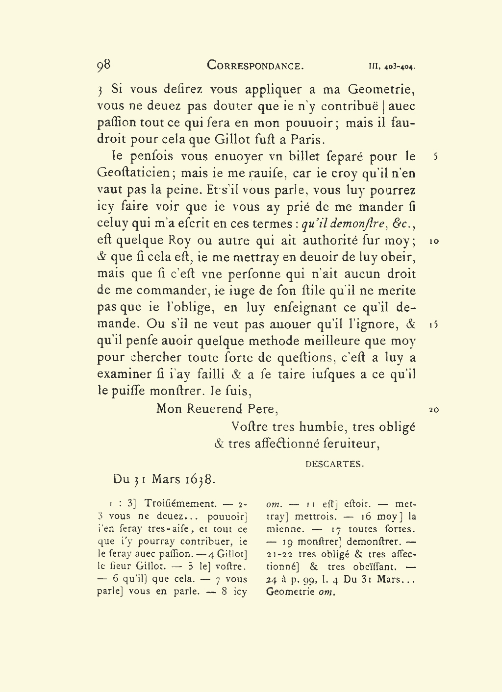 Mars, toutes deux en mesme temps, en quoy i’admire que la derniere soit venuë si viste ; car ie n’en avois iamais receu aucune de si fraische datte. Pour l’accusation du Geostaticien, que ie ne donne rien des équations que Viete n’ait donné plus doctement, nego majorem ; Car comme ie croy vous avoir desia remarqué quelqu’autre fois, ie commence en cela par où Viete avoit finy. Et pour ce qu’il dit, que ie ne suis pas excusable de n’avoir pas veu Viete, il auroit raison si i’avois ignoré pour cela quelque chose qui fust dans Viete, ce que ie ne croy pas qu’il m’enseigne par ce beau Livret qu’il en a autrefois fait imprimer. Pour les lieux solides, il est aisé d’amplifier ce que i’en ay écrit ; car ie ne les enseigne que par un corollaire qui contient iustement onze lignes, à sçavoir, AT II, 83